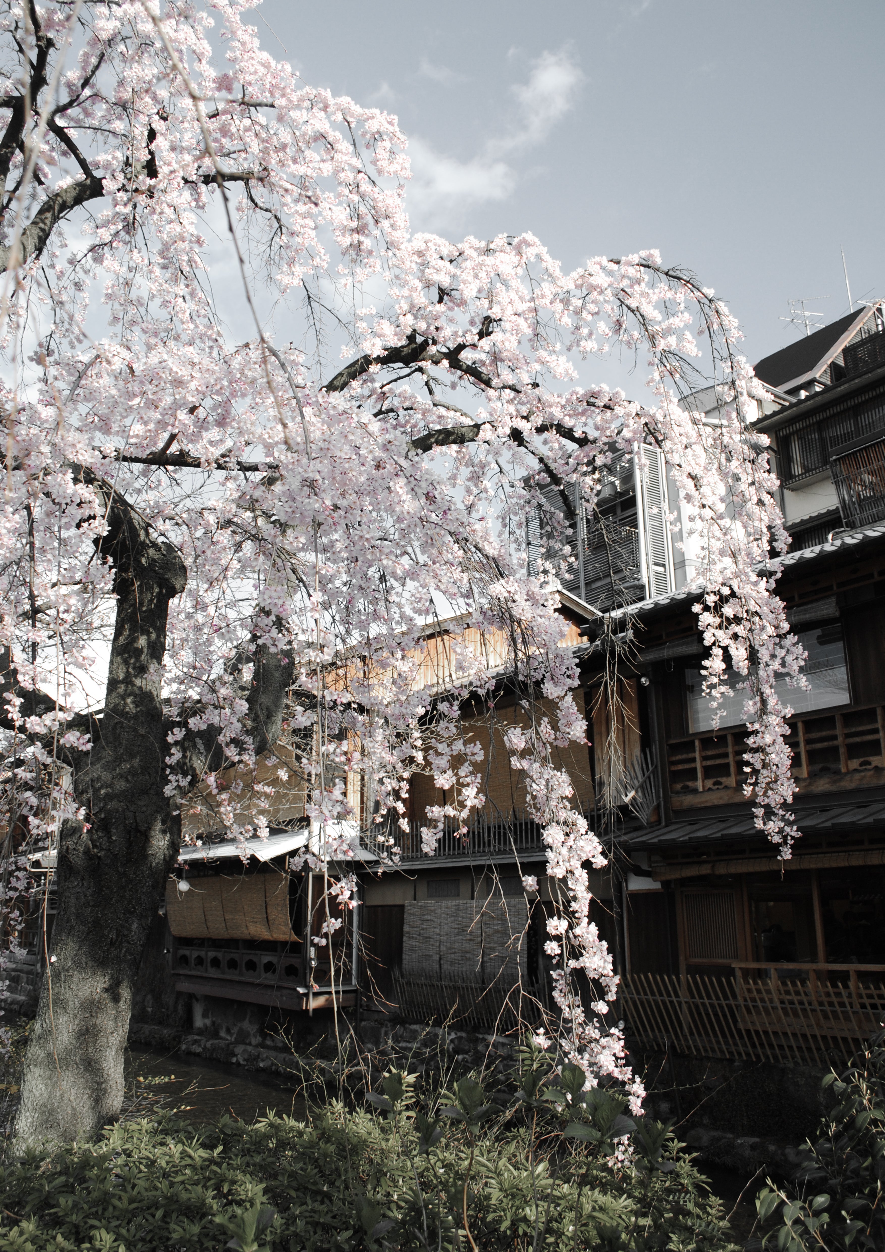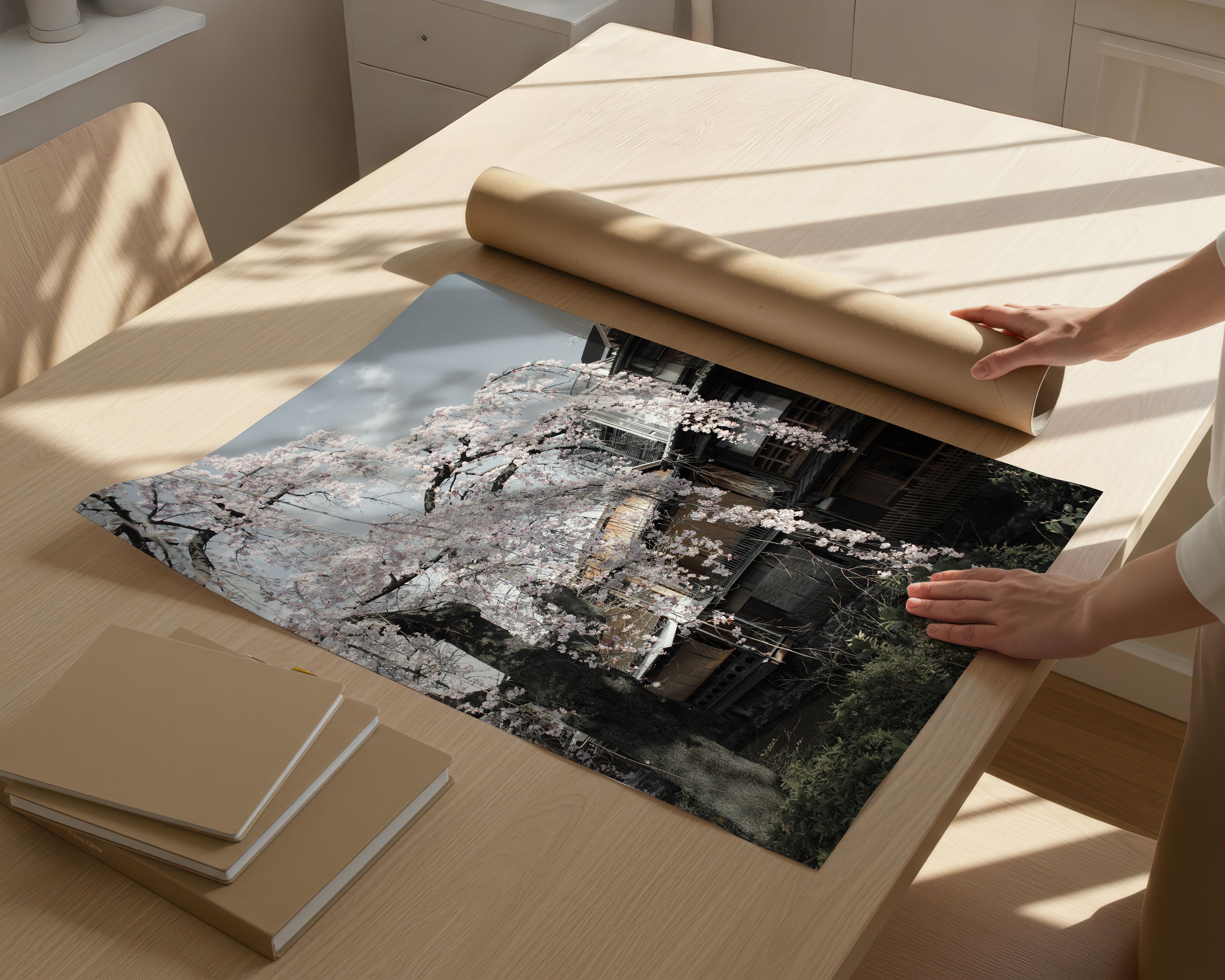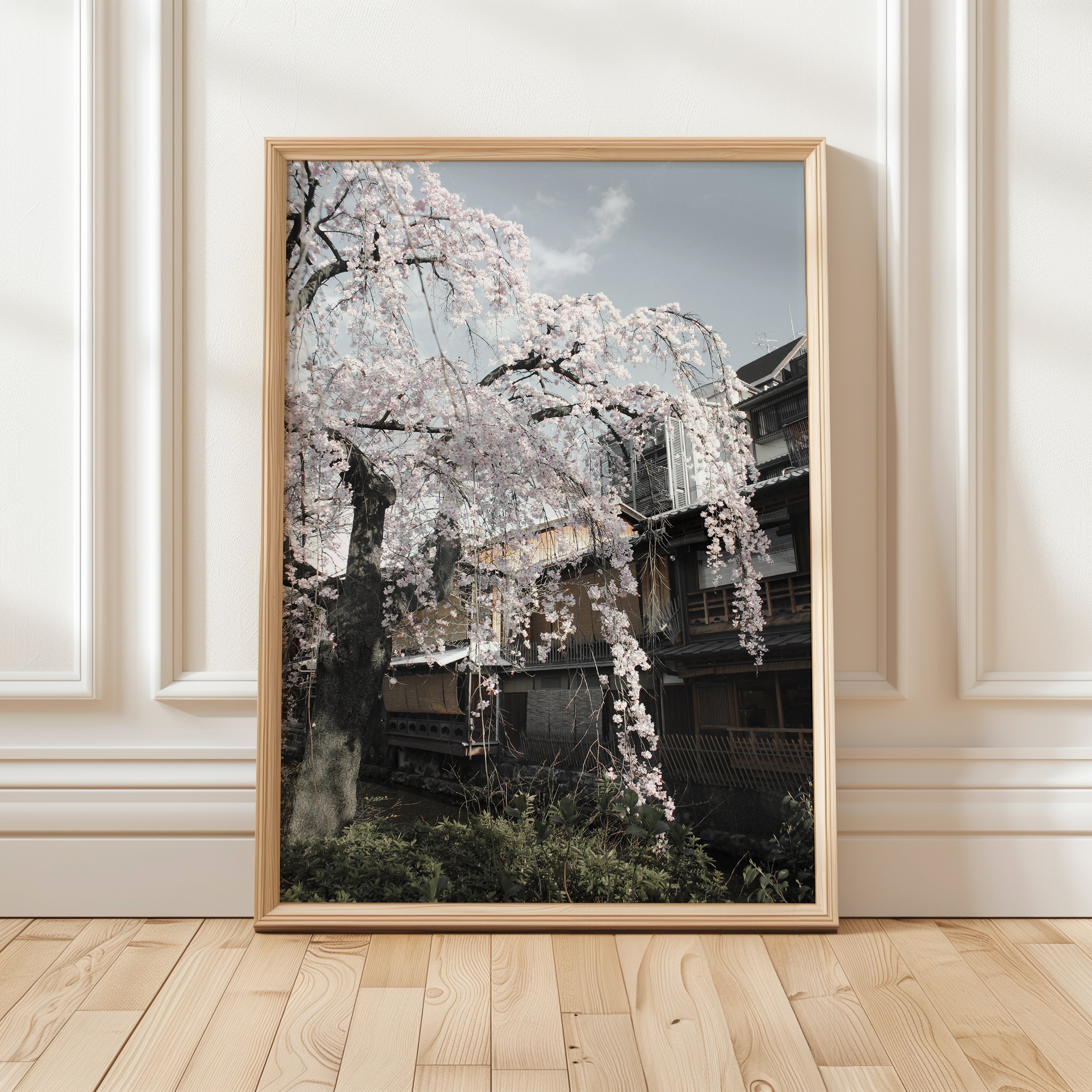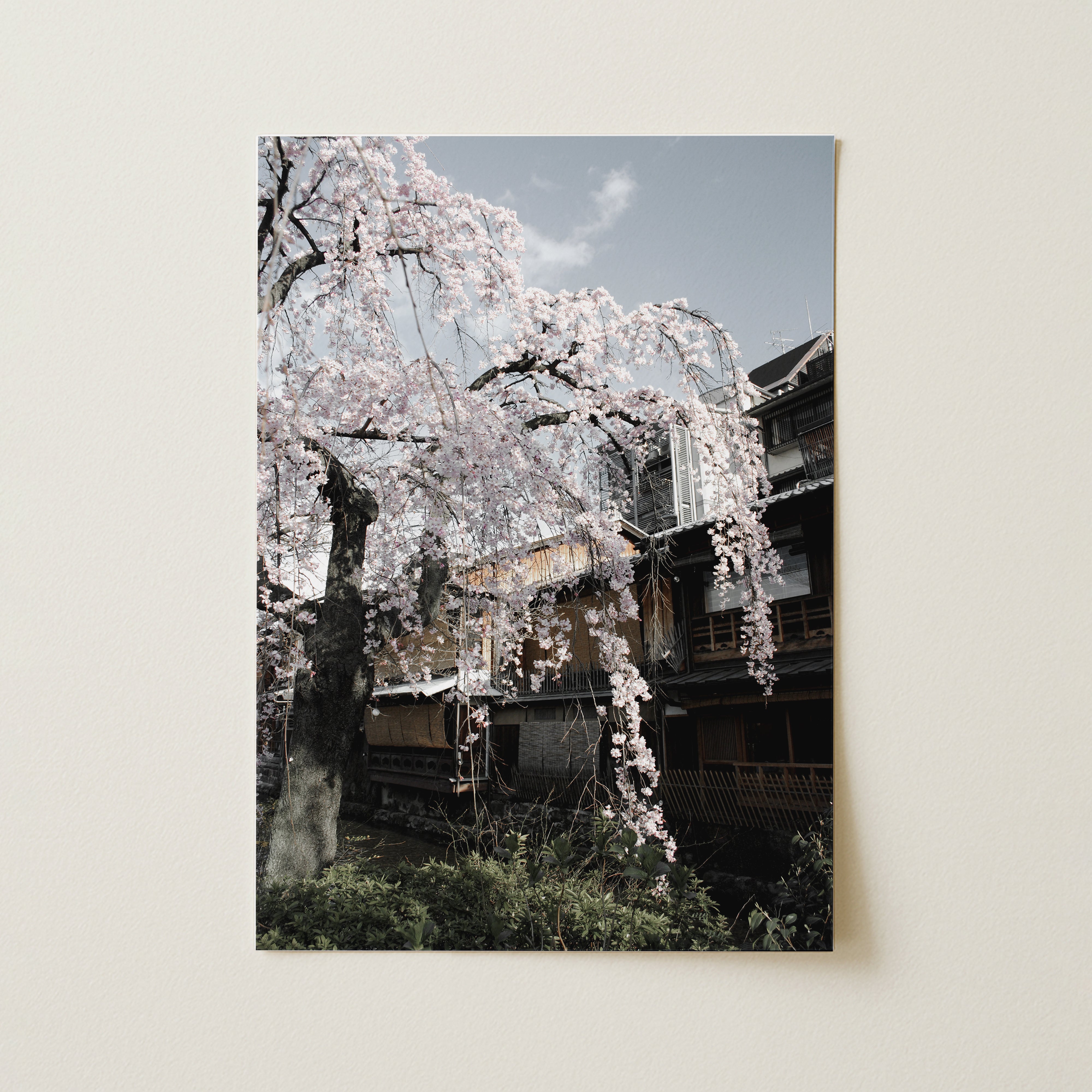 Sakura No.2 captures a tranquil moment along a traditional Japanese riverside, where soft blush blossoms drape gracefully over timber buildings. The muted tones and gentle light create a quiet sense of nostalgia and seasonal renewal. Subtle architectural details balance the organic movement of the branches, blending nature and built form in a calm, poetic way.
