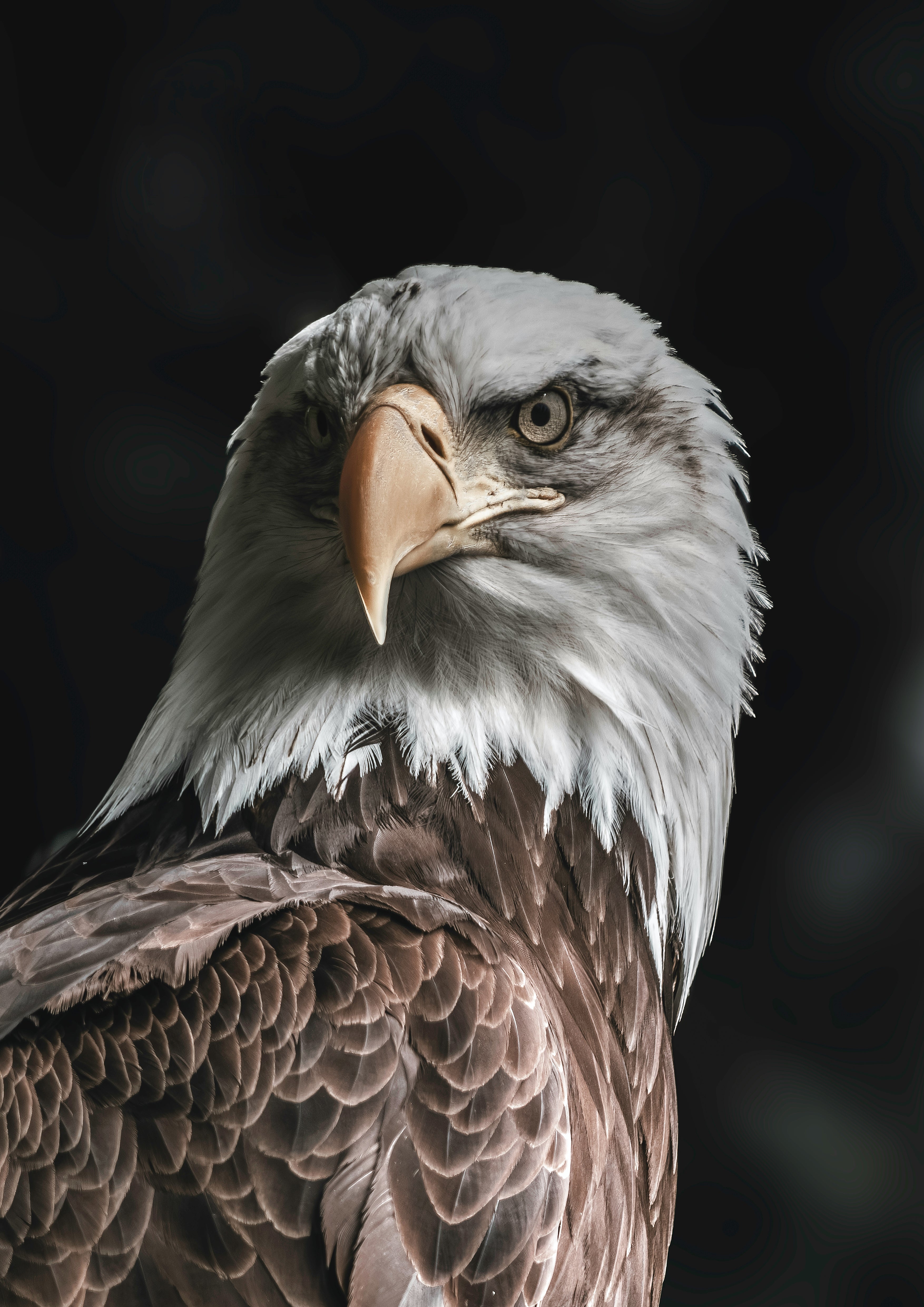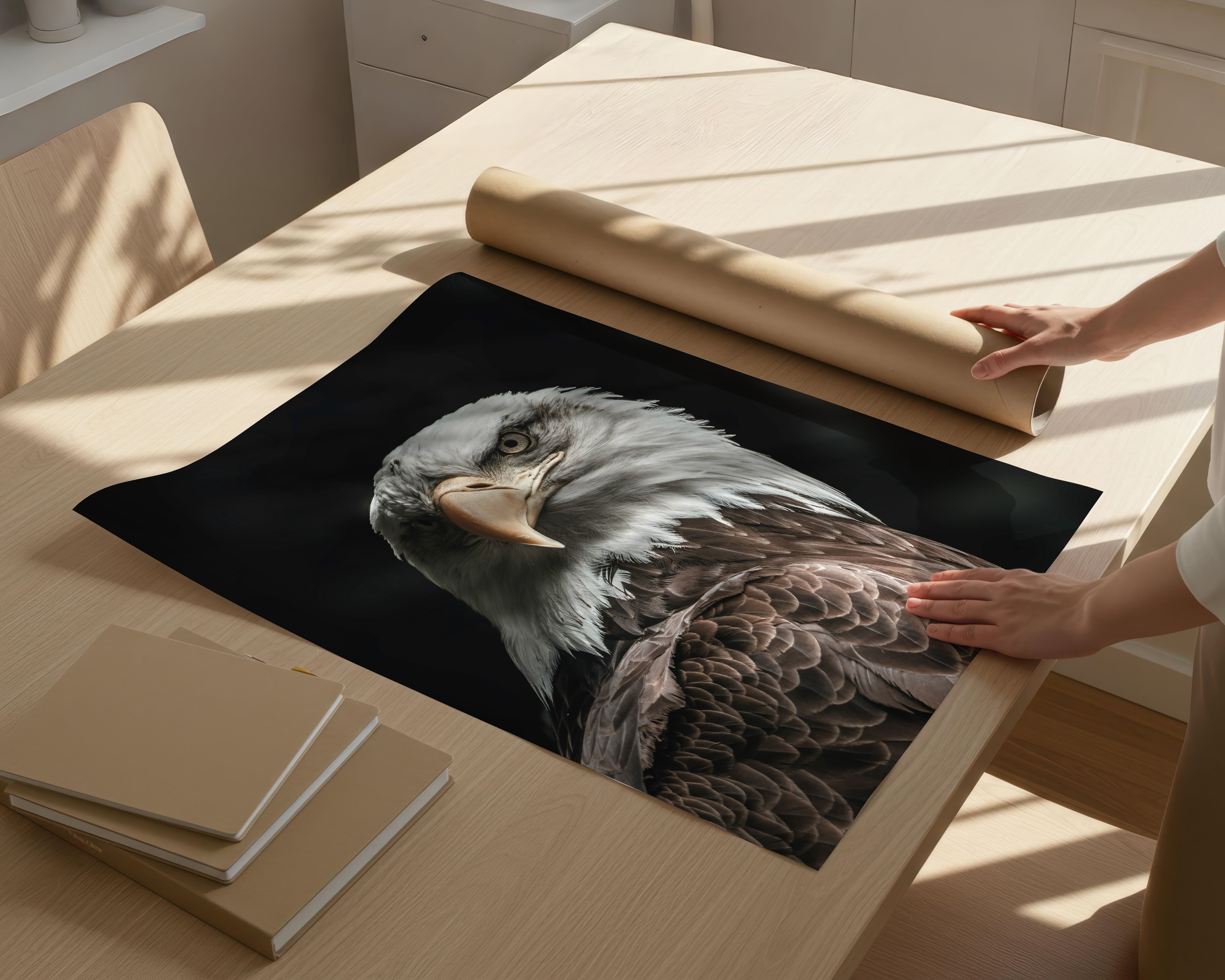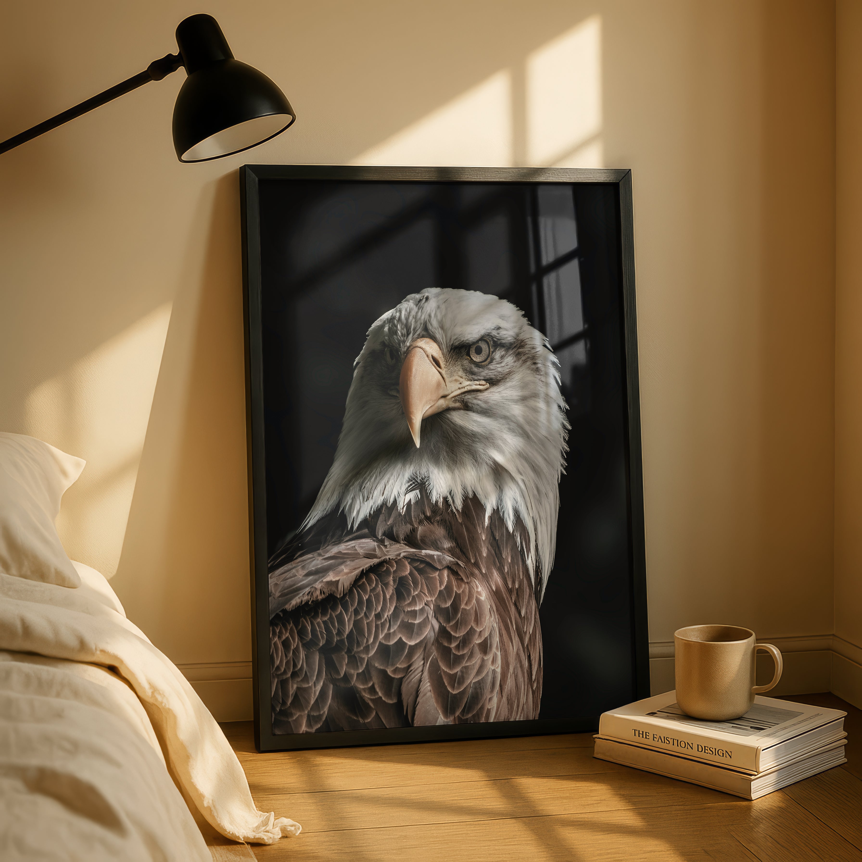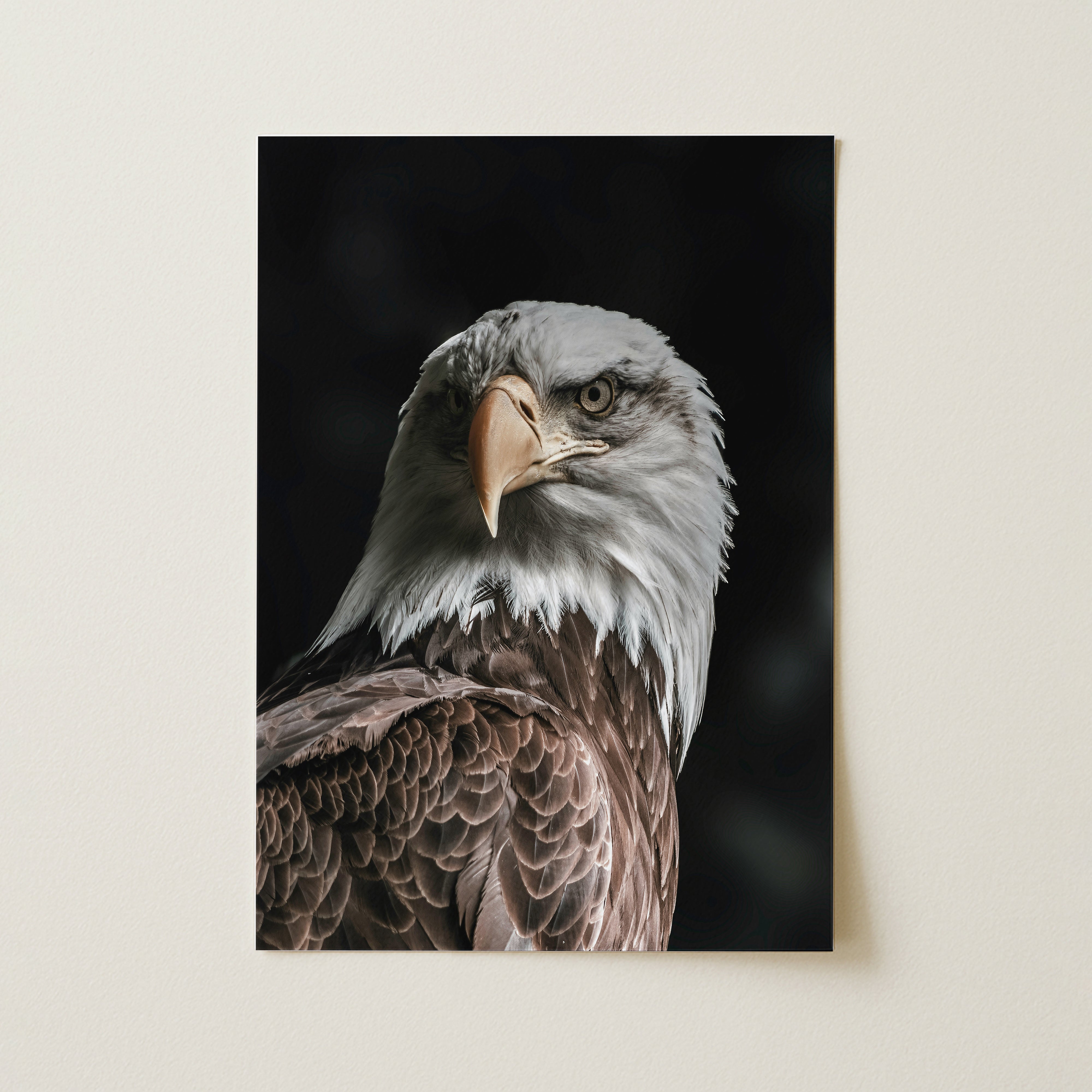 Monarch of the Skies captures a commanding portrait of a bald eagle in striking detail. Set against a dark, dramatic backdrop, the sharp gaze, layered feathers, and sculpted beak emphasise power, precision, and quiet dominance. The result is a bold and majestic statement piece that adds depth and intensity to any space.