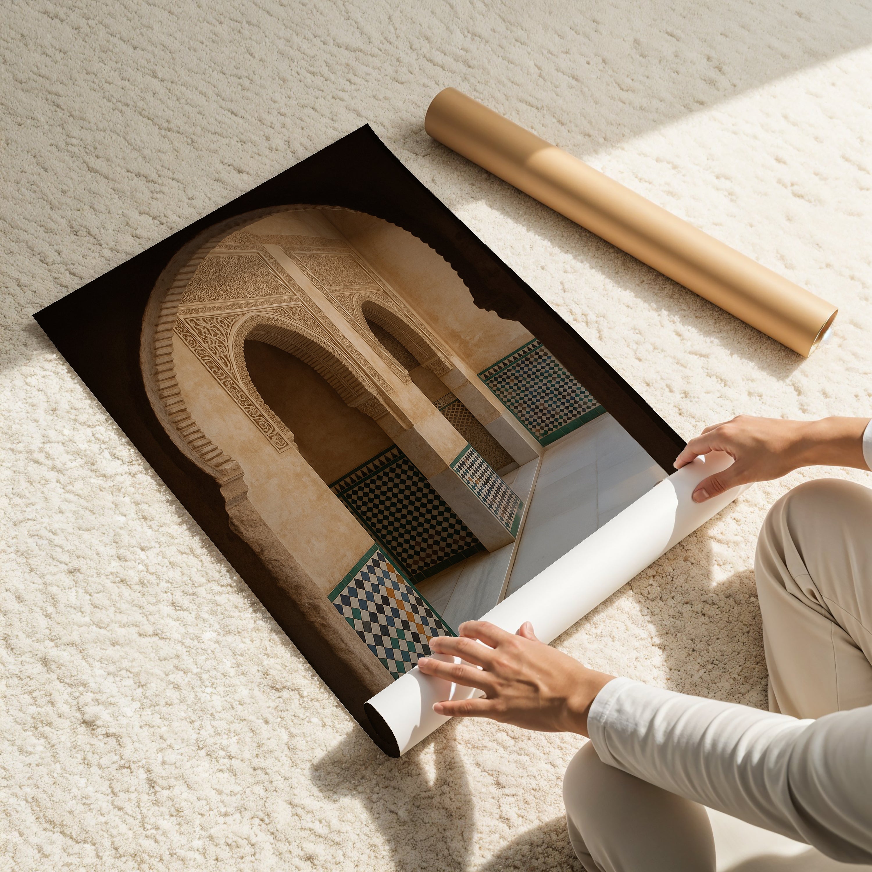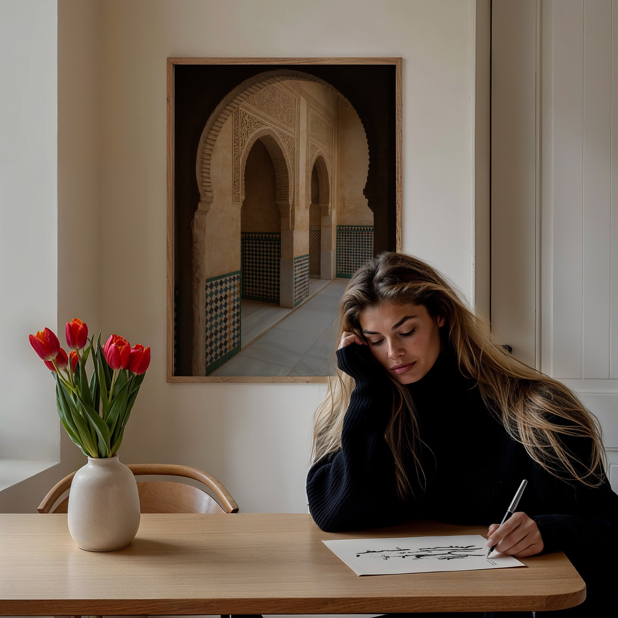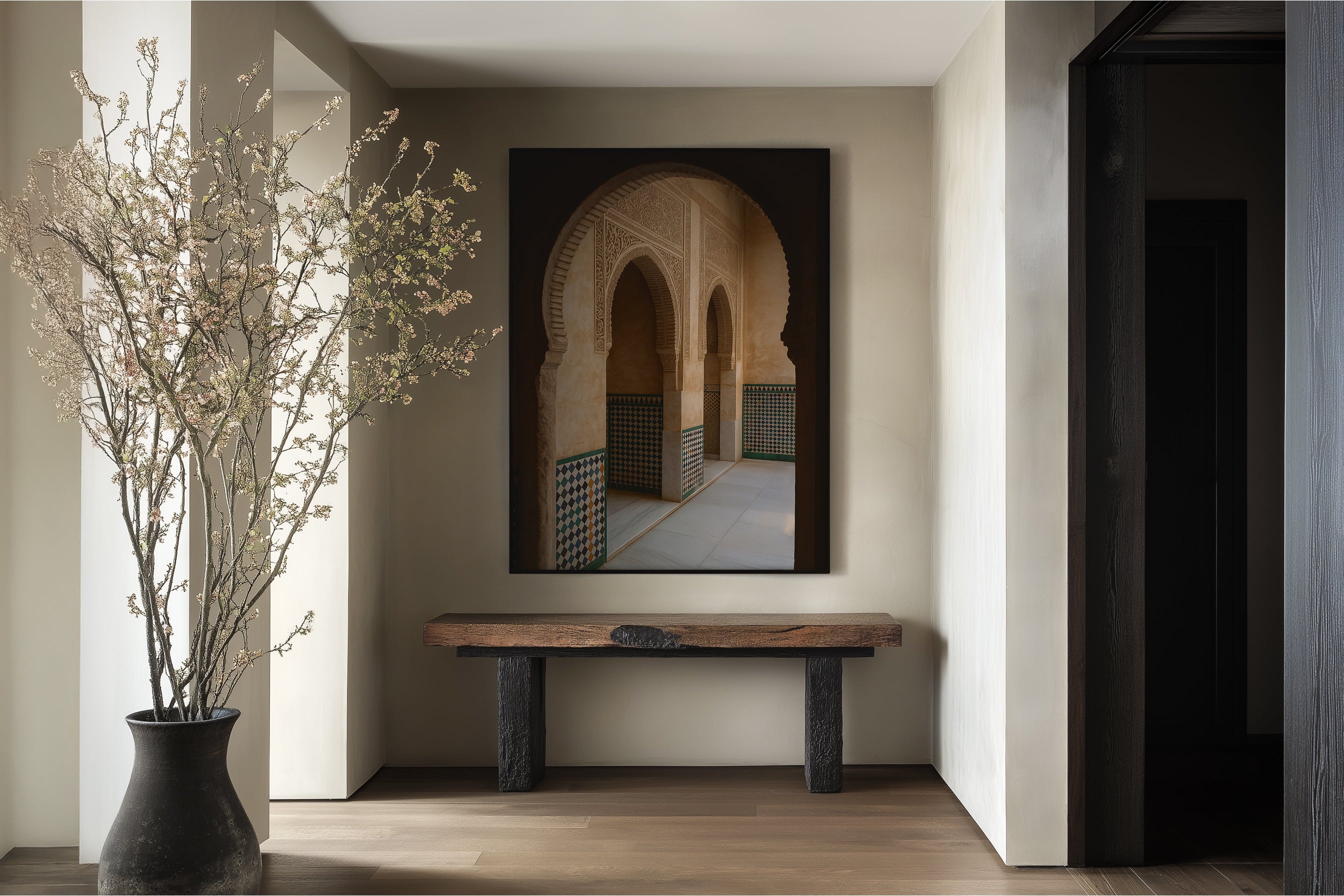 Moorish Passage captures the quiet elegance of Islamic architecture, with soft light filtering through intricately carved arches and patterned tiles. The warm tones of the plaster walls meet cool marble floors, creating a perfect balance of texture and geometry. This artwork evokes the timeless beauty of Andalusian courtyards and sacred spaces.