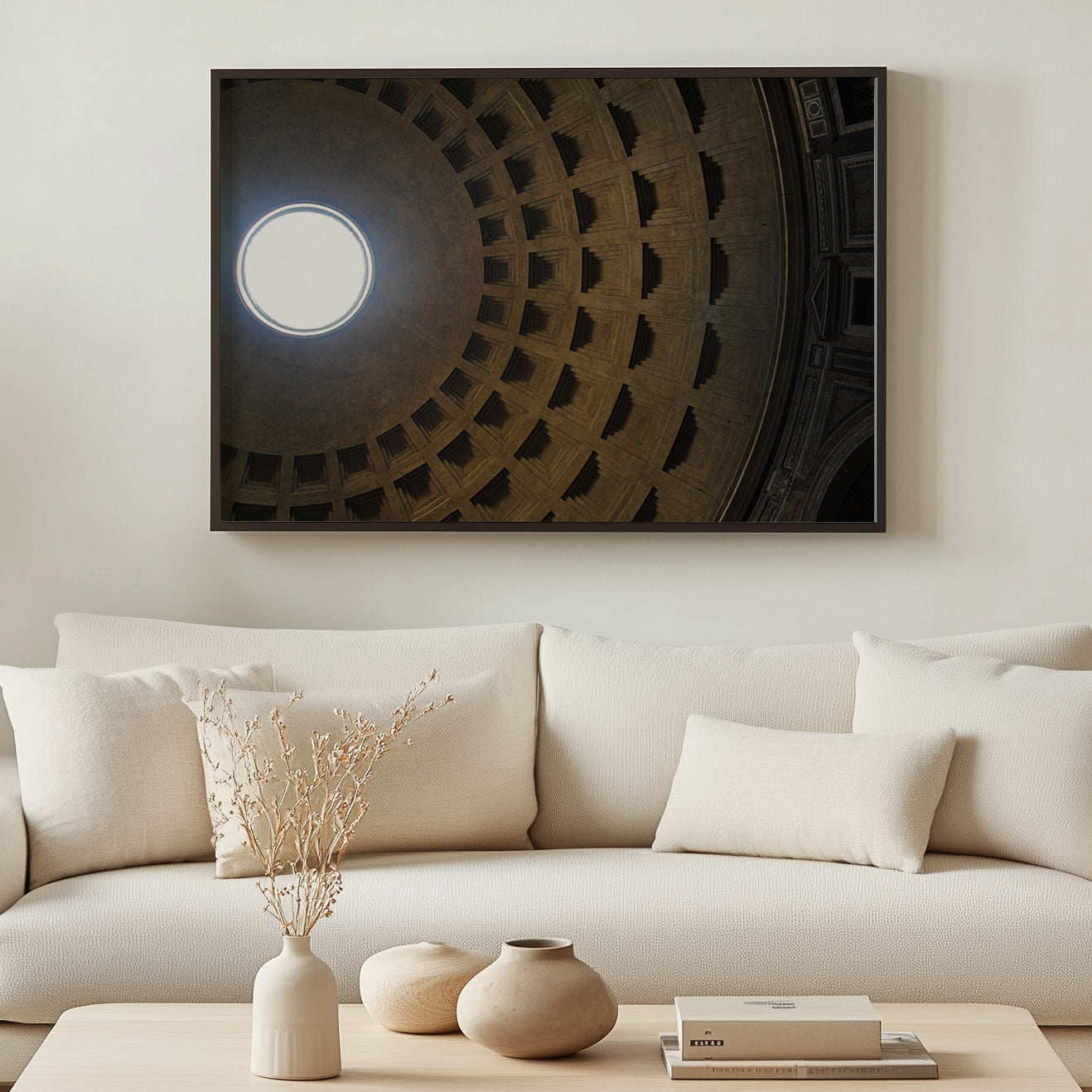 The Oculus captures the timeless geometry and grandeur of the Pantheon’s coffered dome in Rome. The photograph looks upward toward the oculus, where light pours through the circular opening, illuminating the ancient concrete structure with a quiet, ethereal glow. The balance of shadow and form reveals the mathematical perfection and enduring mastery of Roman architecture.