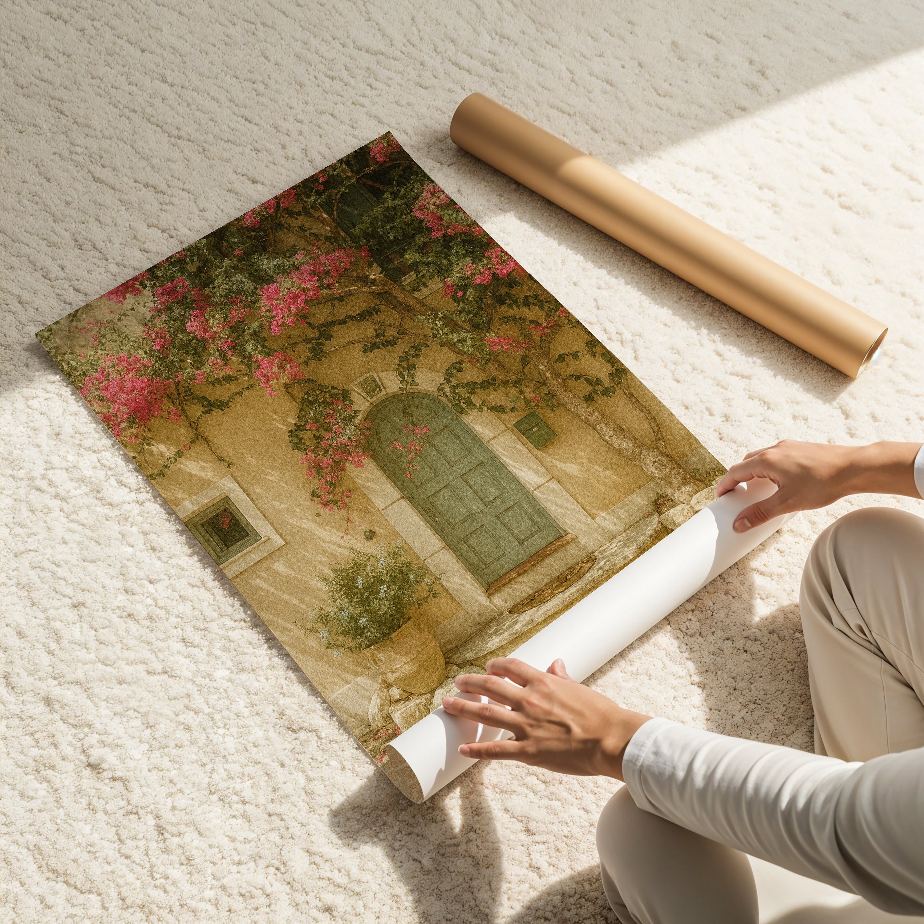 Casa Fiorita captures the sunlit poetry of Mediterranean architecture. A stone villa framed by a cascade of bougainvillea in full bloom. The soft, golden light plays across textured walls and the mint-green door, evoking the warmth of long summer days and slow afternoons in a quiet village.