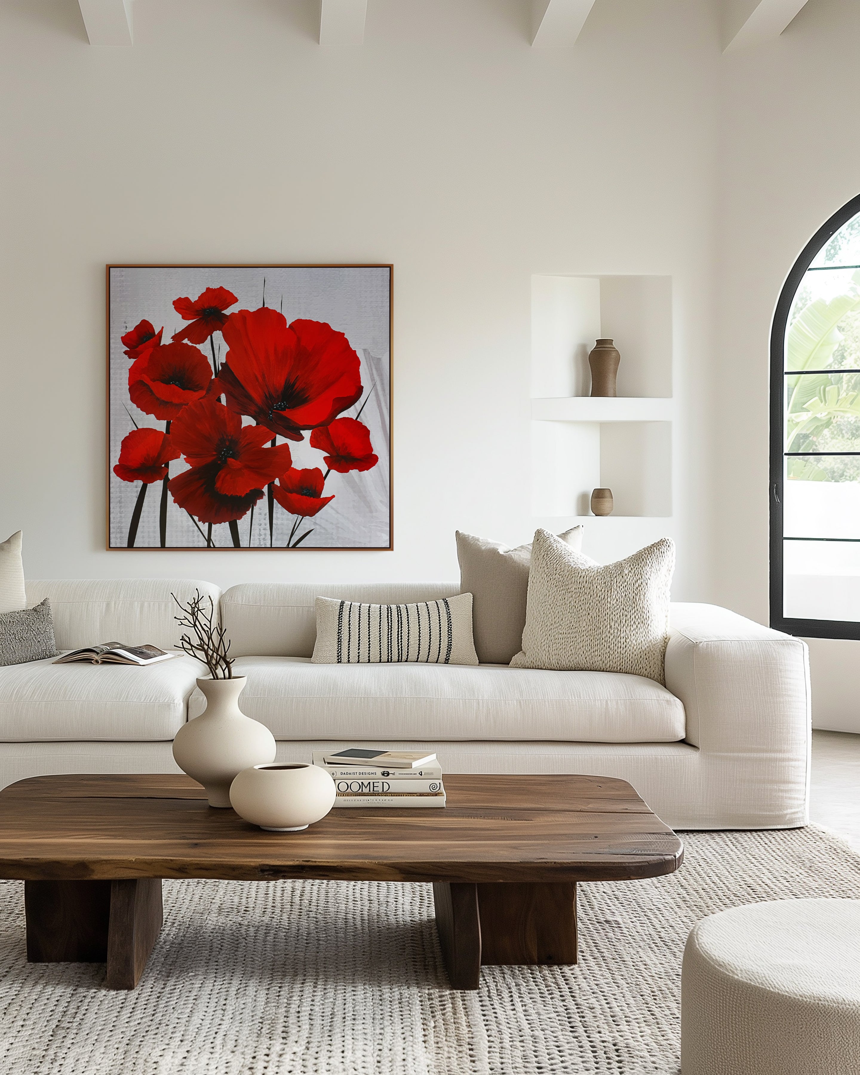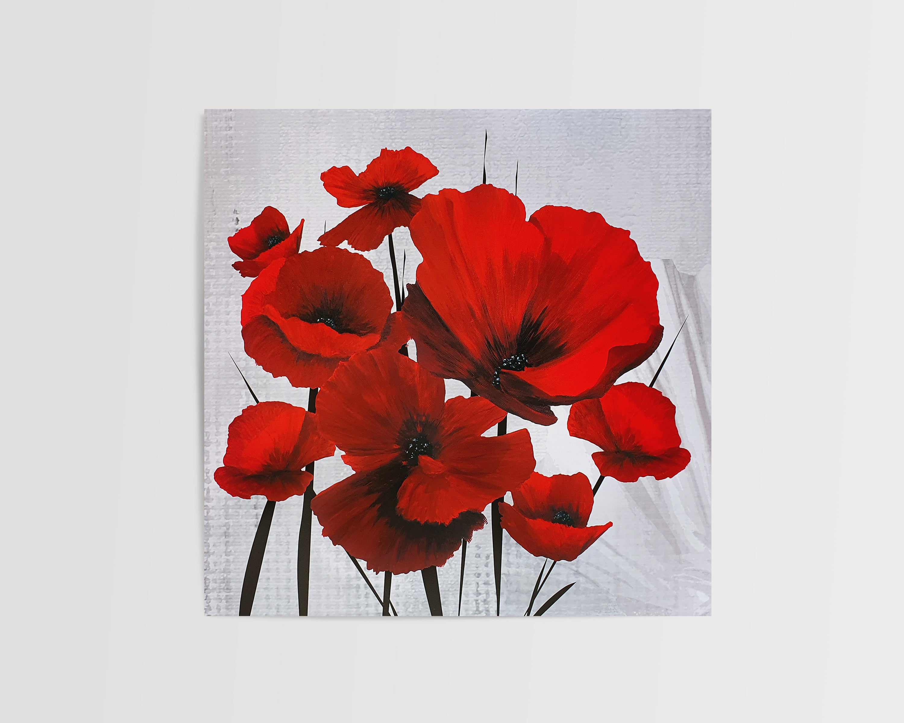 Crimson Reverie bursts with energy and depth, featuring a vivid bouquet of red poppies that seem to pulse against a soft, textured backdrop. Each petal is painted with rich tonal variation, from velvety scarlet to deep crimson, giving the piece a striking sense of dimension and movement.