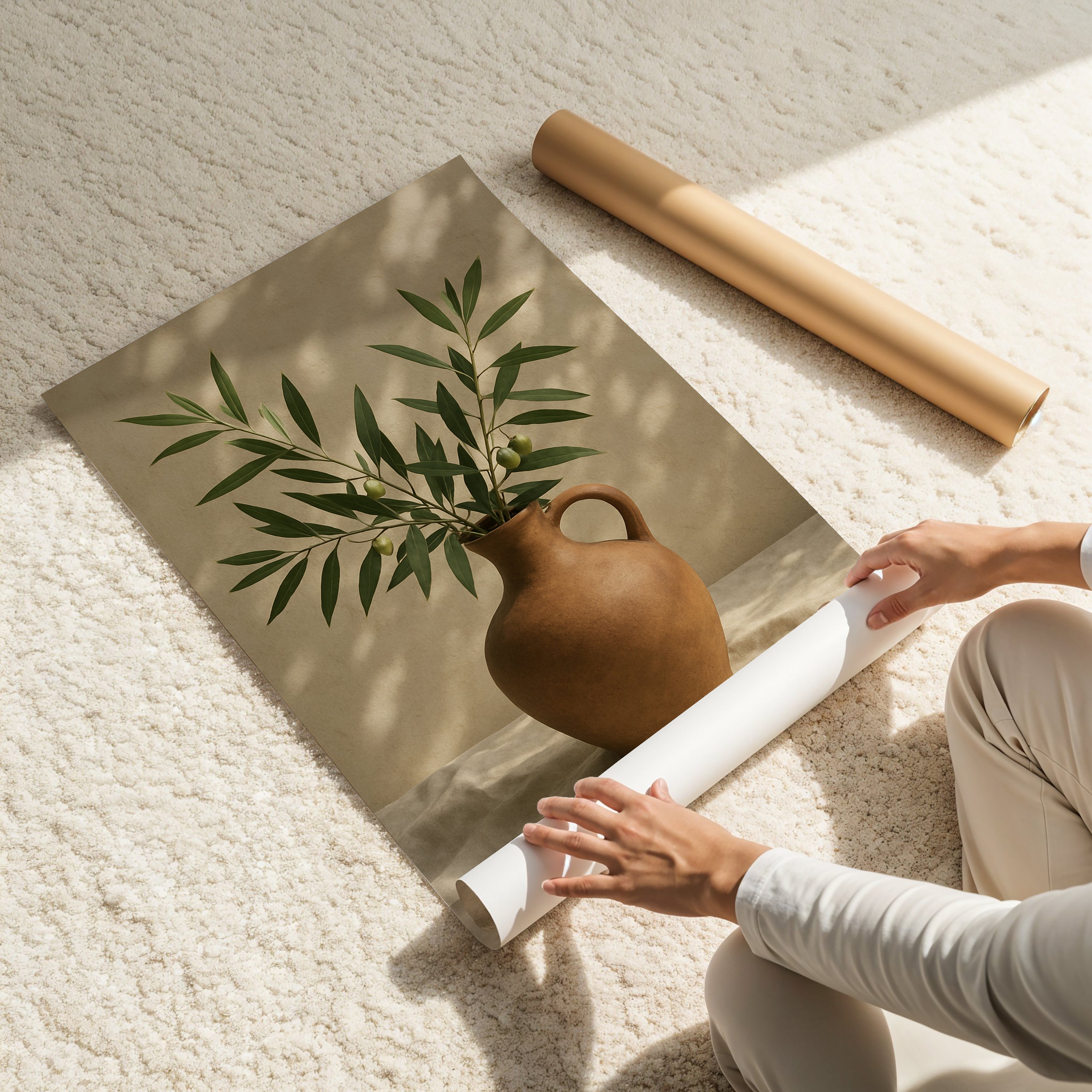 Olive Branch in Clay Jug captures rustic simplicity with Mediterranean calm. A single earthenware jug holds slender olive branches, their green fruit and leaves illuminated by dappled light. The warm clay tones contrast gently with the soft beige backdrop, evoking the quiet beauty of slow afternoons and timeless design.