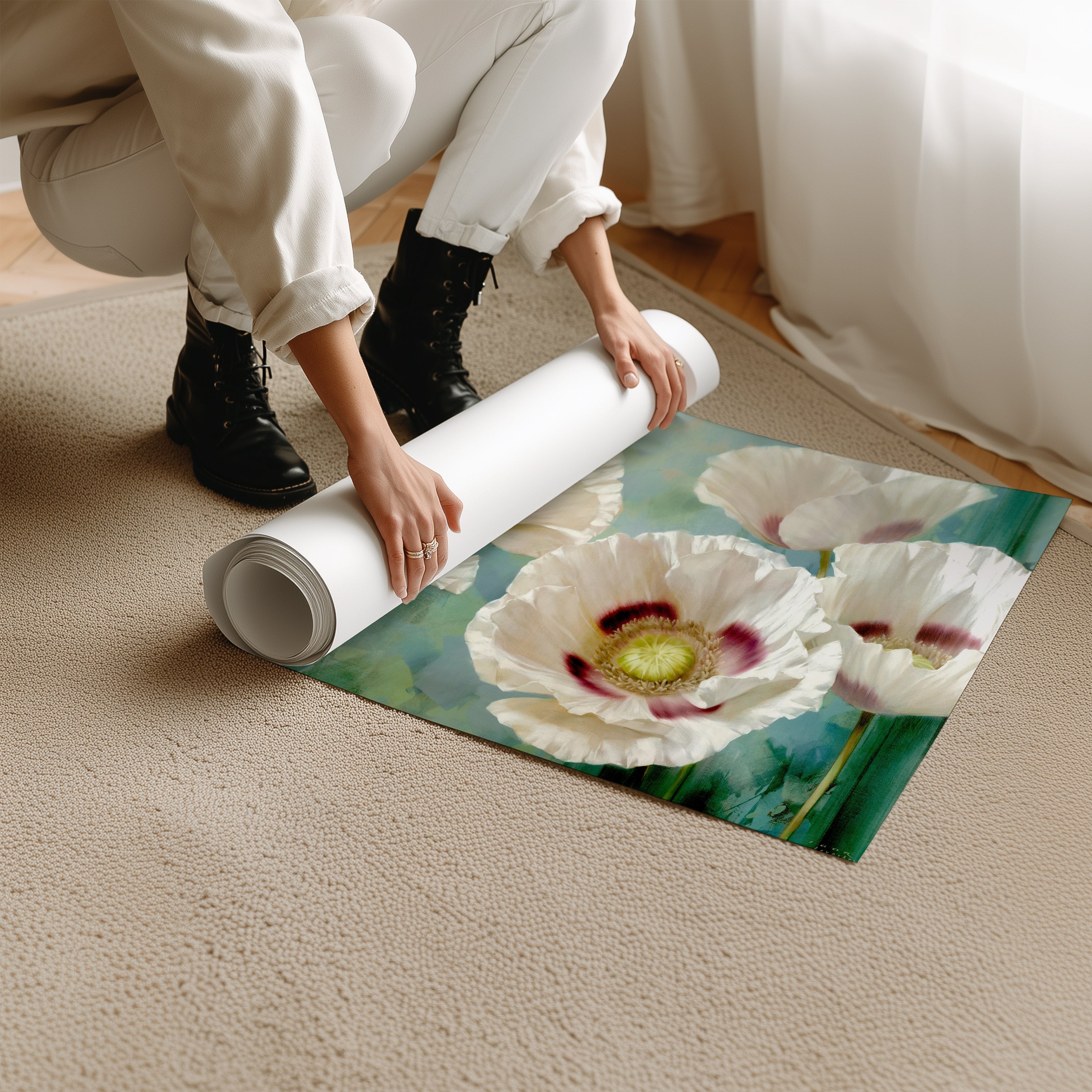 asmanian Poppies by Igor Levashov is a breathtaking floral study that captures the delicate translucence of white poppies bathed in soft light. Each petal glows with subtle gradients of cream, blush, and lilac against a tranquil green-blue background. Levashov’s meticulous attention to light and texture transforms these blooms into an elegant, almost ethereal composition.