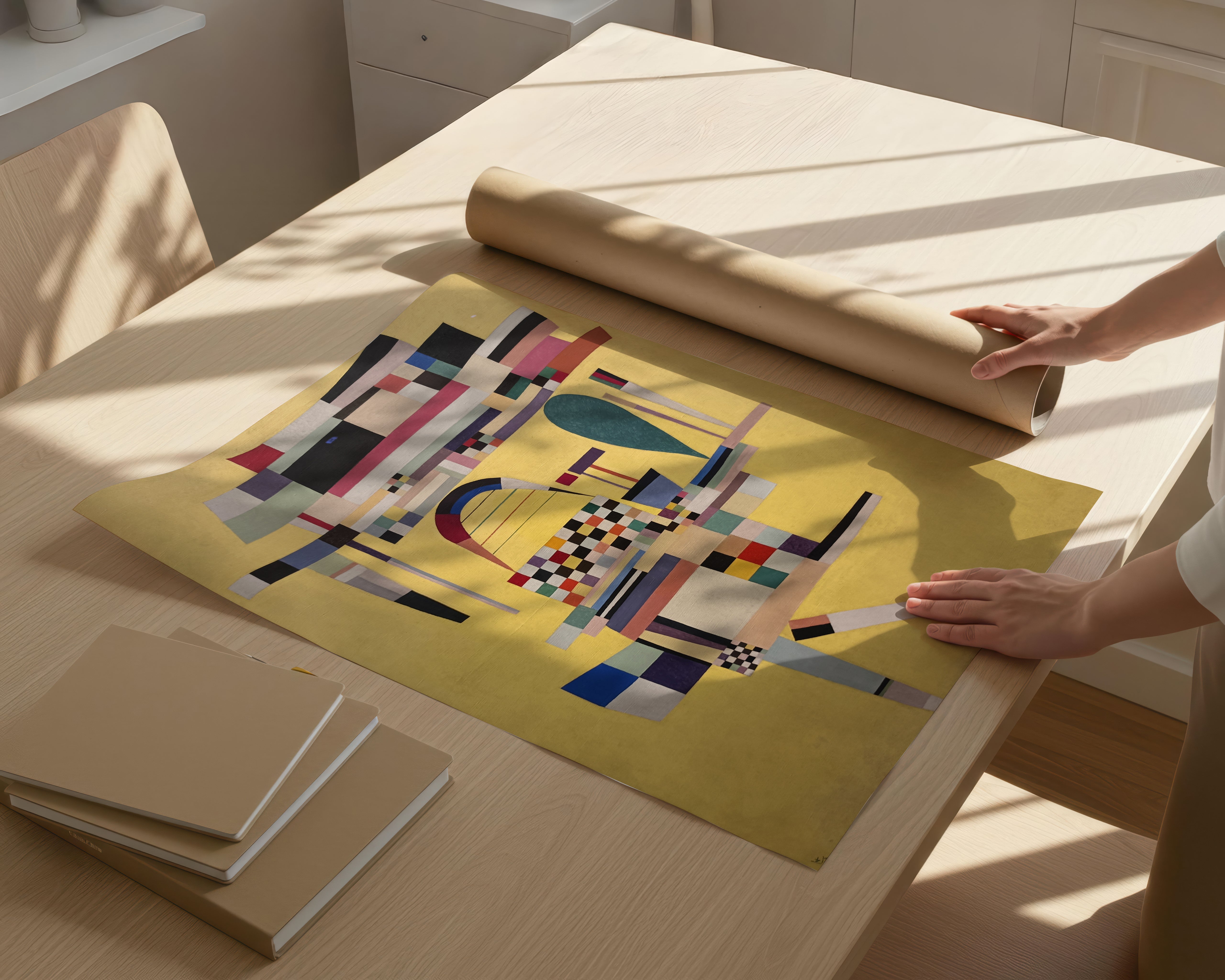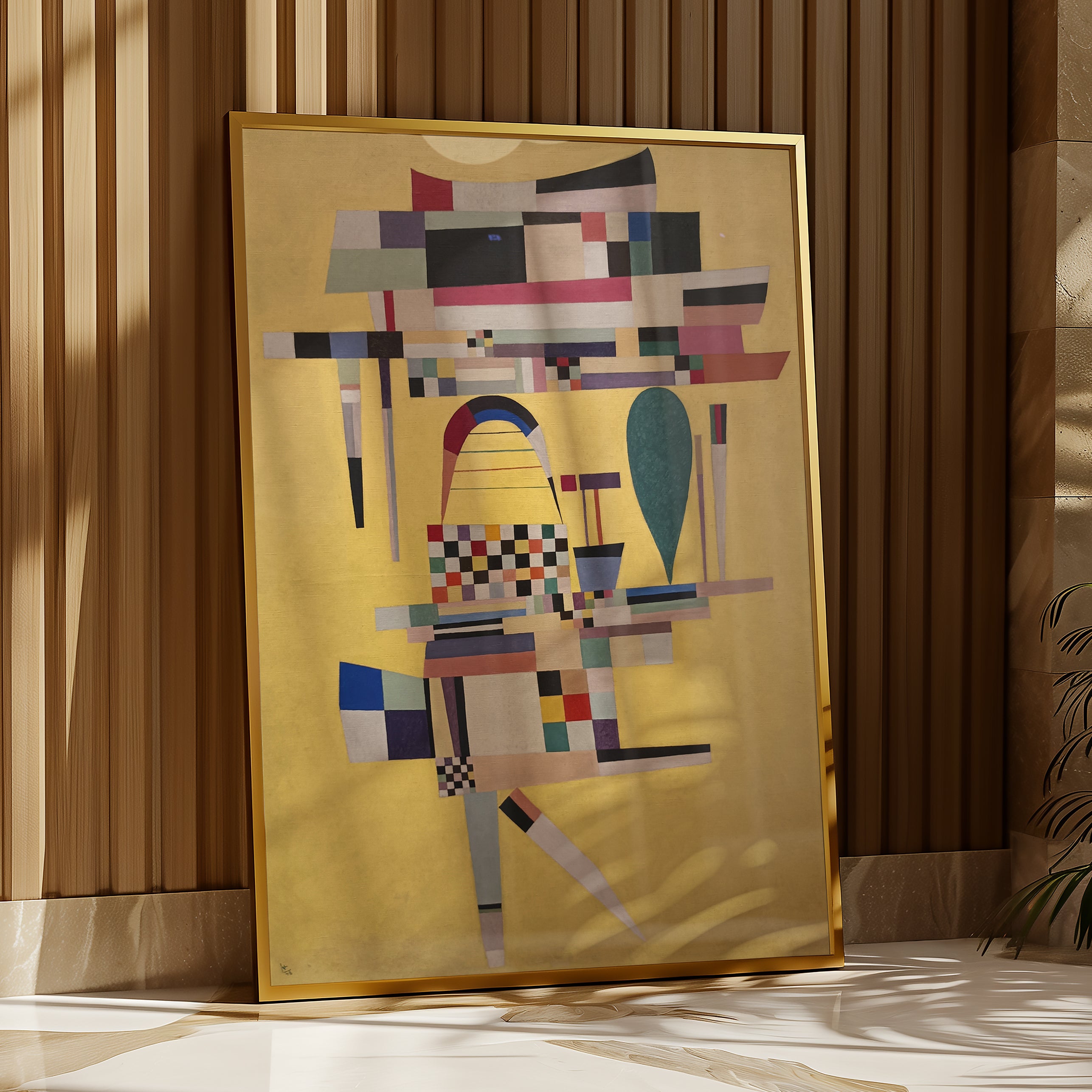 Yellow Painting is a bold abstract composition inspired by the work of Russian painter Wassily Kandinsky. Geometric forms, layered colour blocks, and rhythmic linework sit against a vivid yellow backdrop, creating a playful yet sophisticated visual balance.