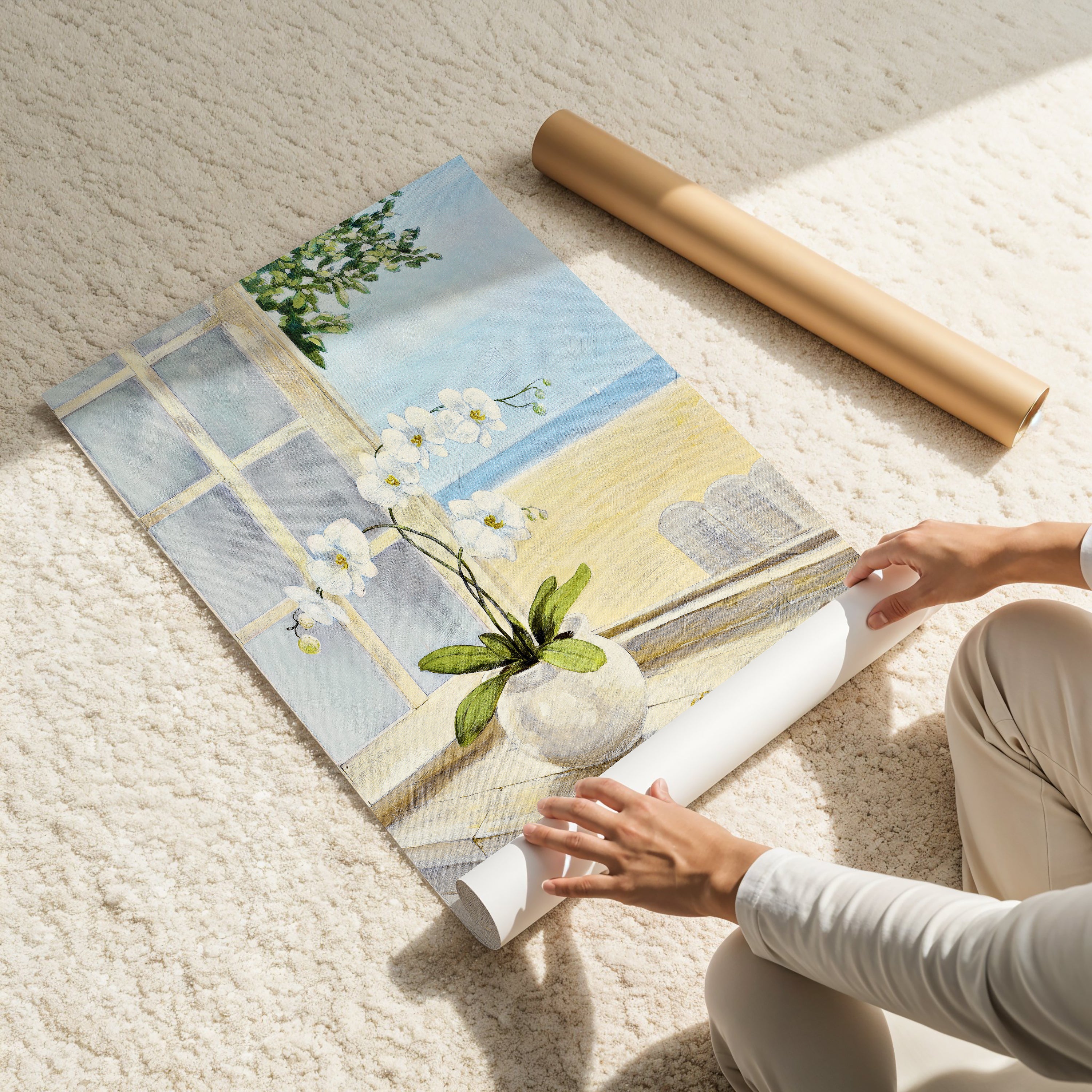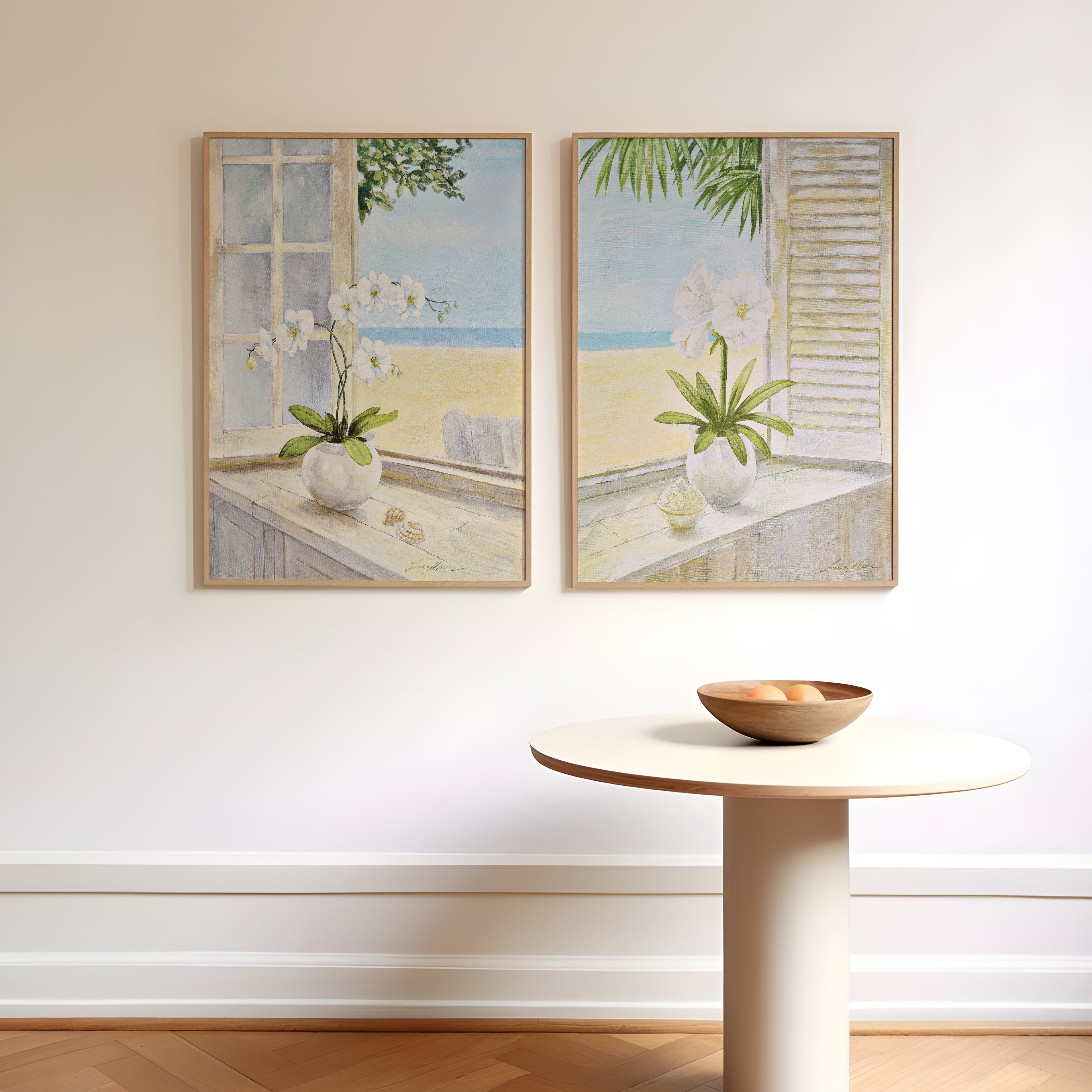 Beachside Blossoms I & II are a serene pair of artworks that capture the calming beauty of coastal living. Each piece features delicate white flowers in simple ceramic vases, placed on sunlit windowsills overlooking sandy shores and soft blue seas. Gentle details, like seashells and decorative bowls, add a touch of charm and intimacy, evoking quiet mornings by the ocean.