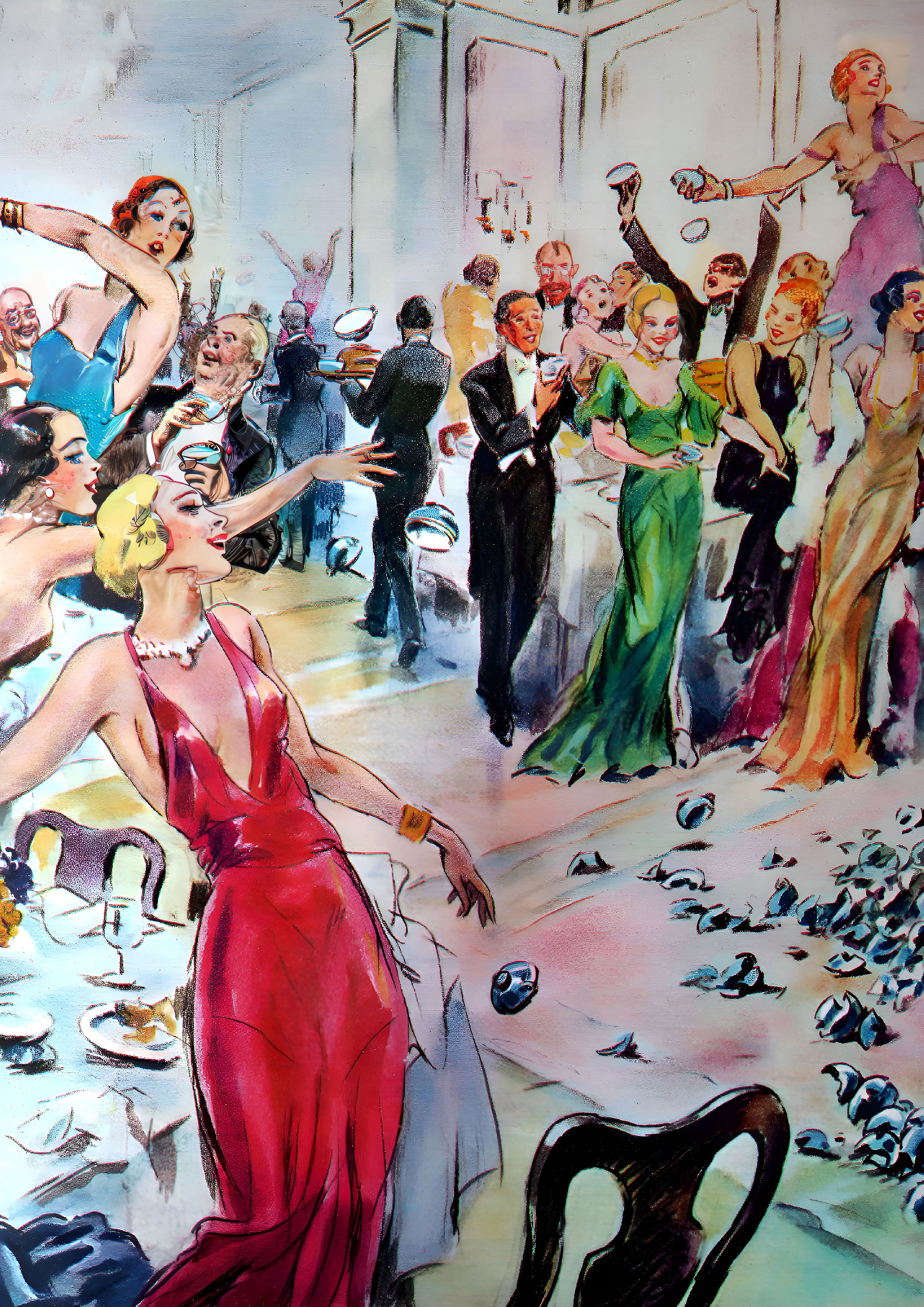 Smashing Plates is a bold and playful art print that captures the spirit of high society revelry. With elegant women in gowns, dashing men in tuxedos and a flurry of broken crockery flying across the scene, the artwork bursts with movement and theatrical energy. The vivid colours and expressive brushwork evoke the glamour of the 1930s, where sophistication and chaos collided in unforgettable style.