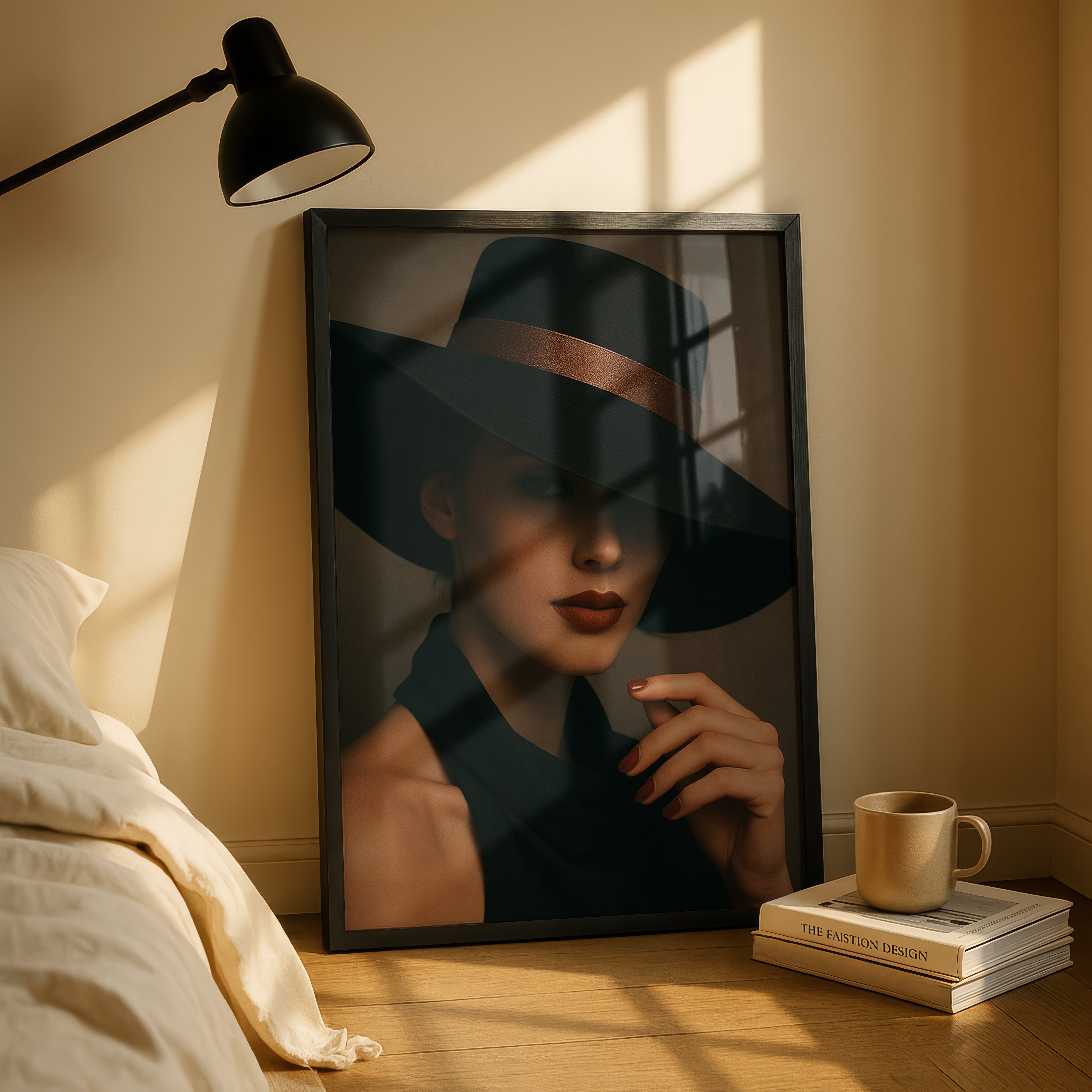 Velvet Gaze is an evocative art print that embodies elegance, mystery and timeless glamour. With her wide brimmed hat casting a shadow across her eyes, the figure is revealed through subtle light and rich tones that create a cinematic mood. The deep lipstick and polished detail of her hand add a refined sensuality, turning this into a portrait that speaks in whispers rather than declarations.