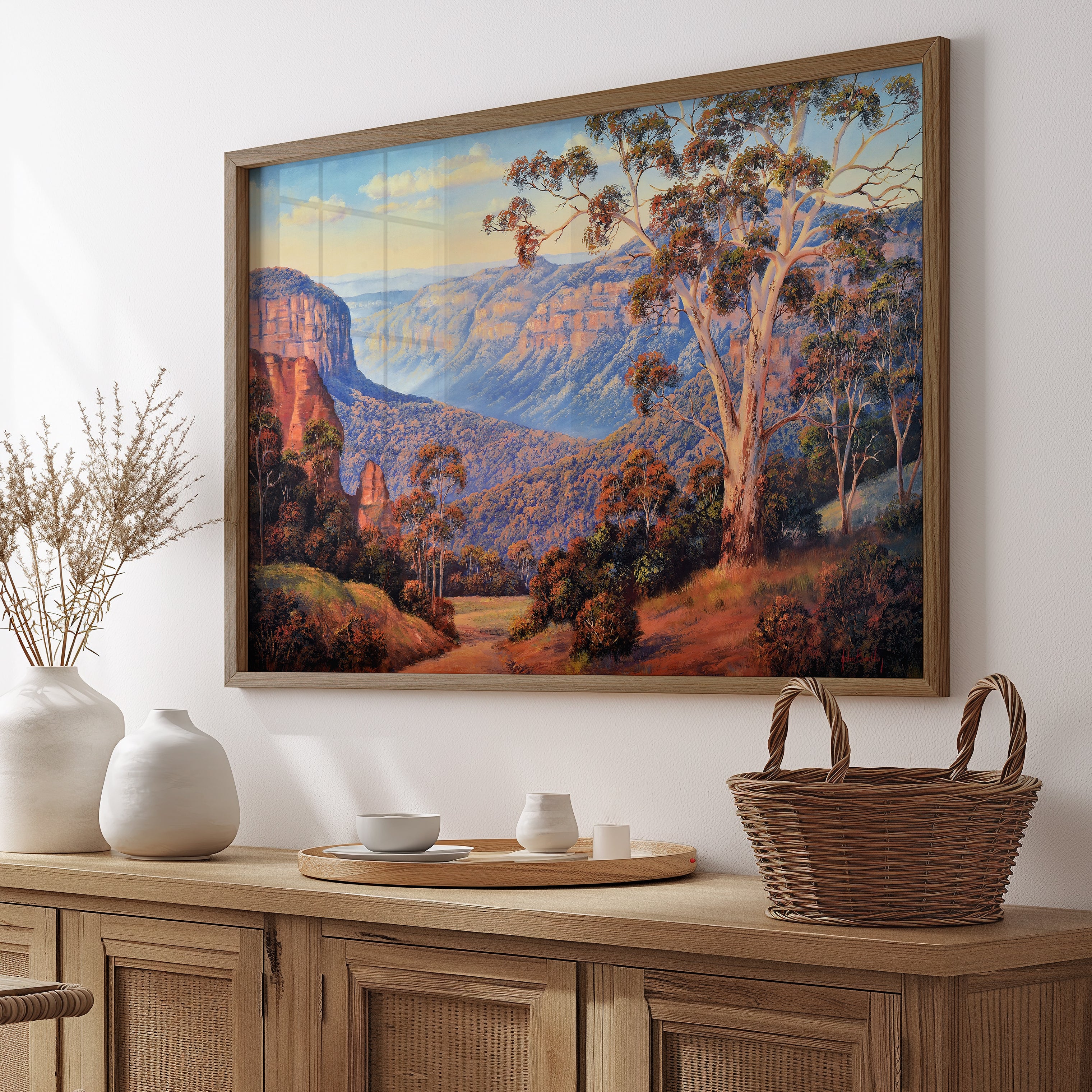 Blackheath, Blue Mountains by John Bradley captures one of Australia’s most breathtaking landscapes with masterful light and atmosphere. The painting immerses you in the grandeur of the Blue Mountains, where sunlit cliffs and deep valleys glow in shades of ochre, violet, and blue. Eucalyptus trees frame the scene with warmth and detail, their rust-coloured leaves catching the late afternoon light.