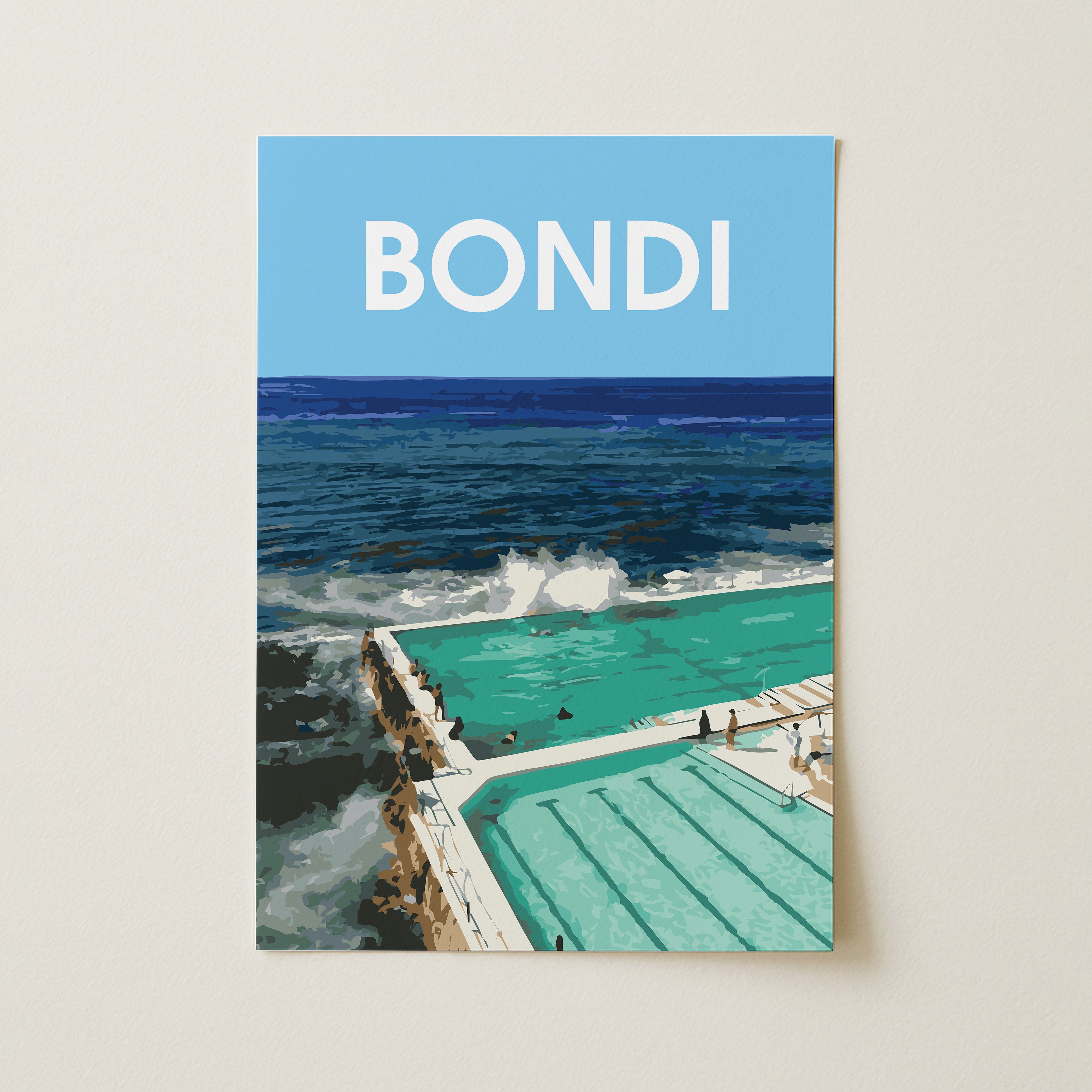 Bondi captures the iconic Bondi Icebergs pool against the sparkling blue of the Pacific Ocean. This bold, graphic print has a clean, modern feel that celebrates one of Australia’s most famous coastal destinations.