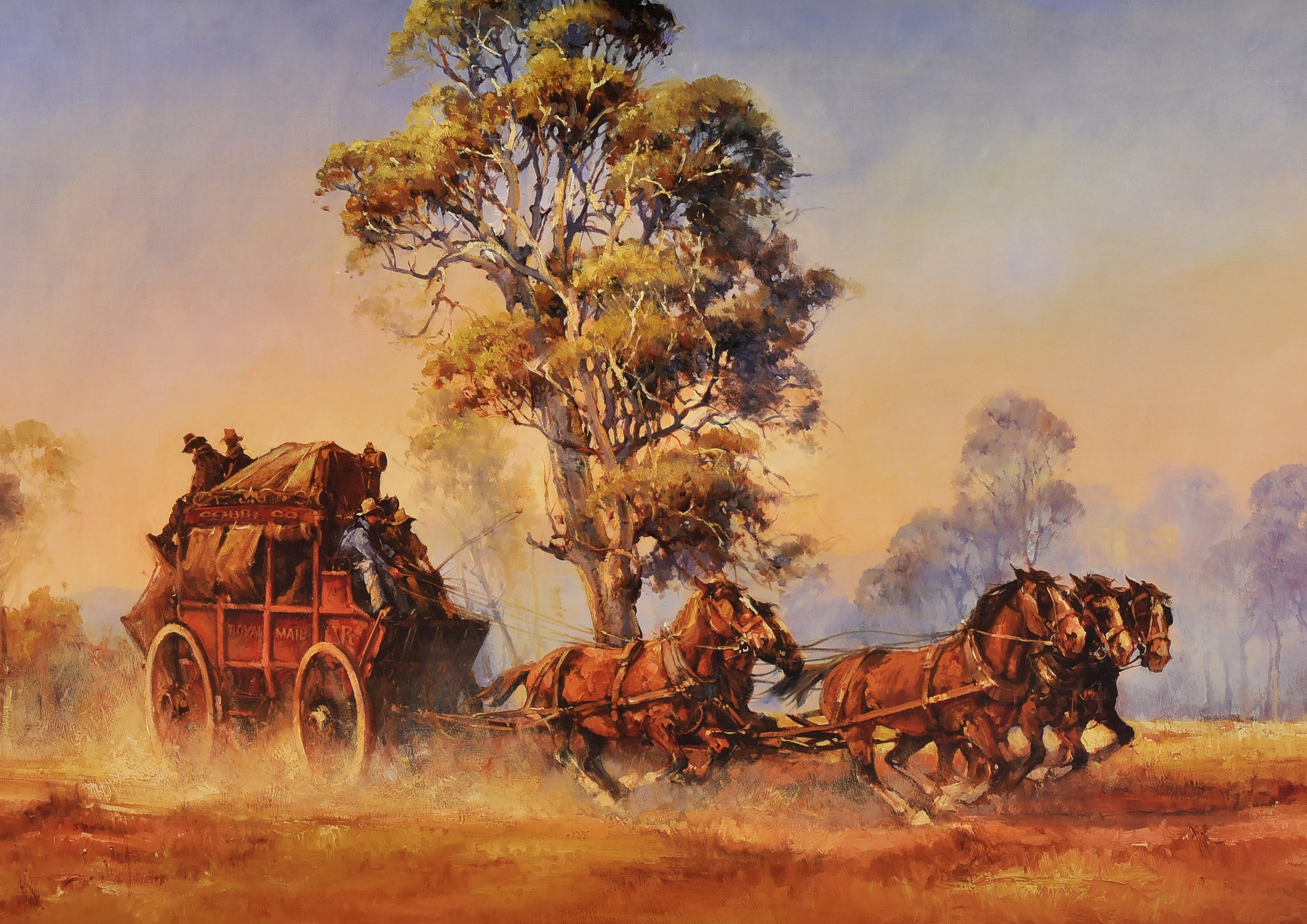Crossing the Plains by D’Arcy W. Doyle captures the grit and grandeur of Australia’s pioneering days. A powerful team of horses thunders across the dry plains, hauling the iconic Cobb & Co coach beneath a blazing outback sky. Doyle’s signature warmth and realism bring the dust, sun, and determination of early rural life vividly to life.