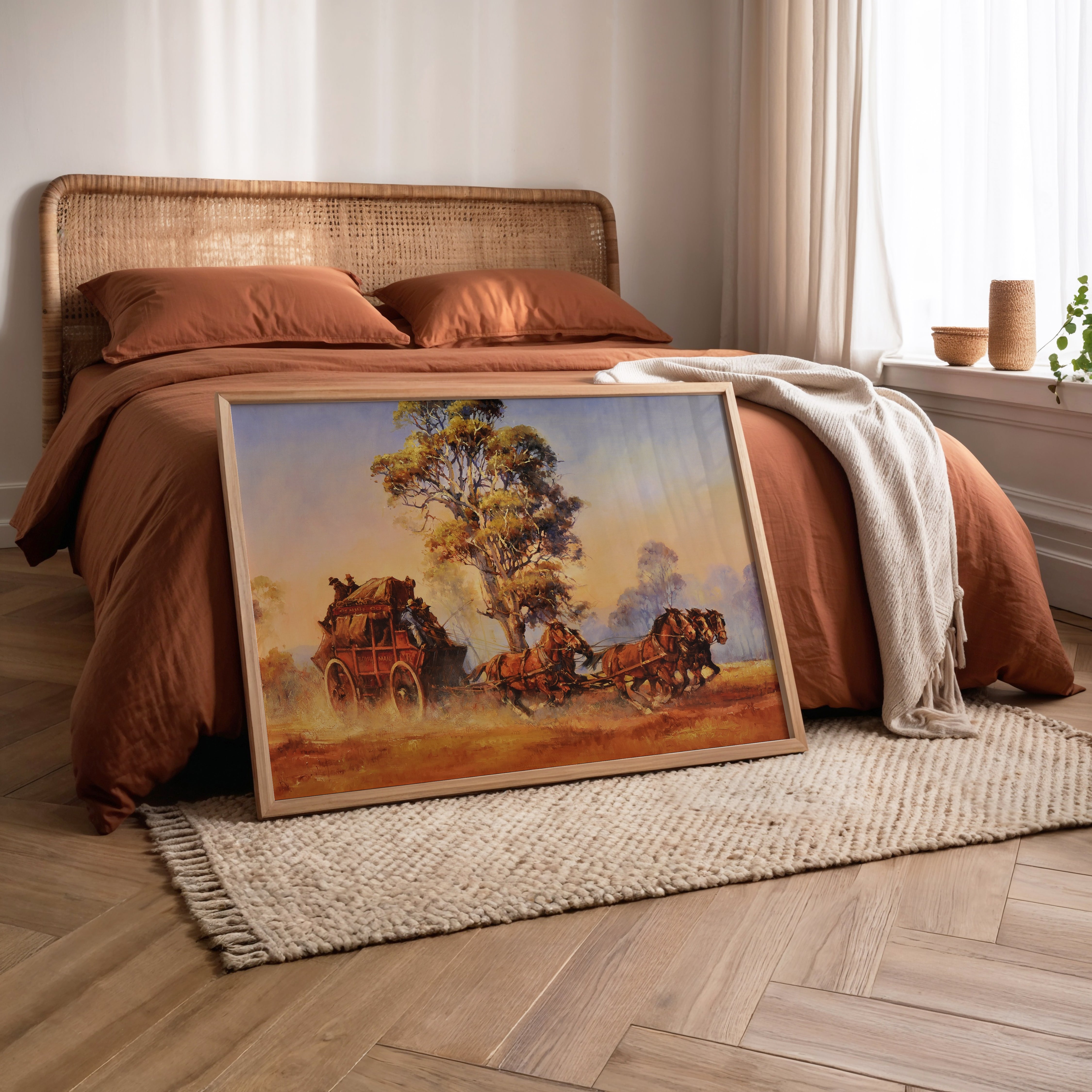 This dynamic piece celebrates endurance, connection, and the timeless beauty of the Australian landscape. Ideal for homes that appreciate heritage, storytelling, and the romance of the outback, it brings a sense of movement and nostalgia to any space.