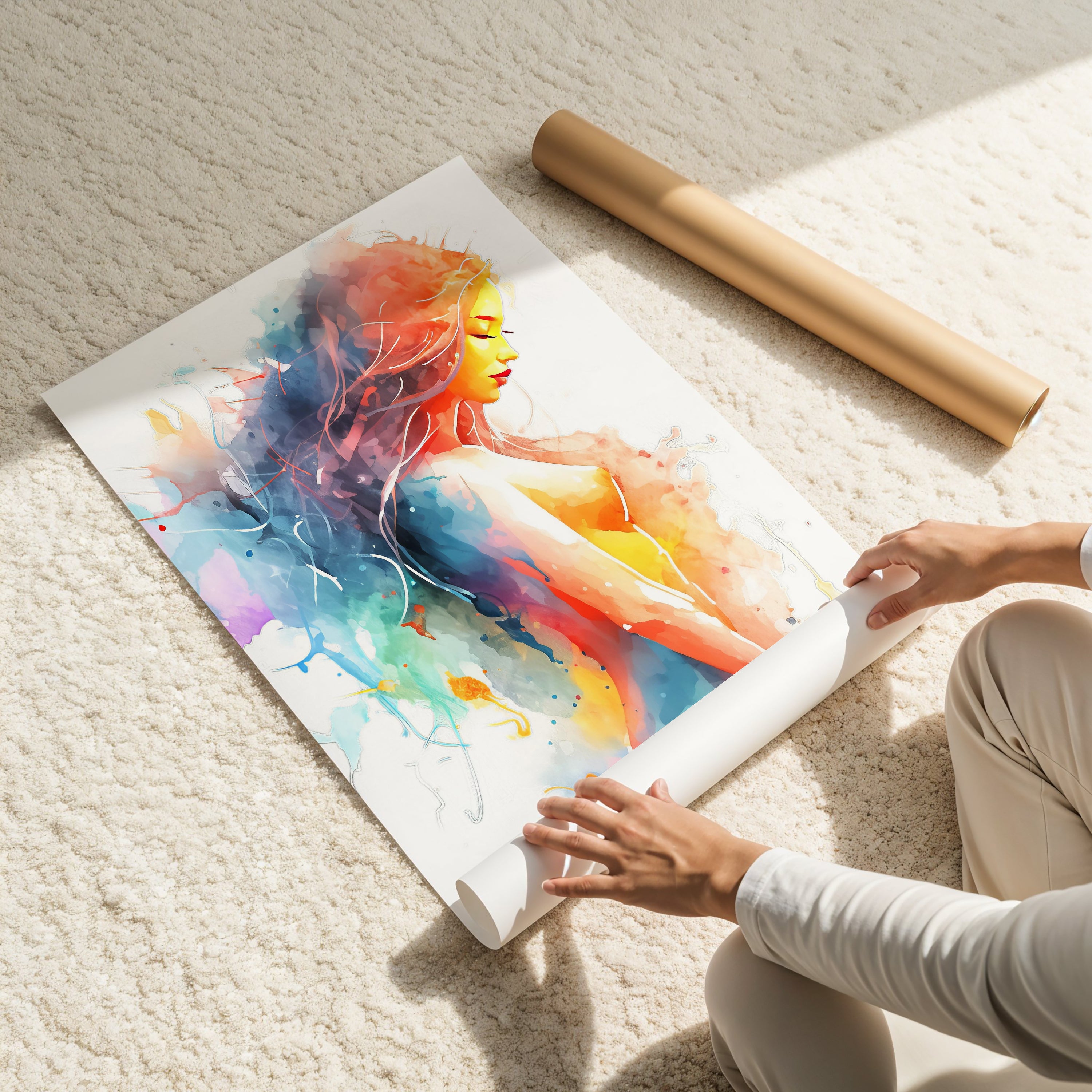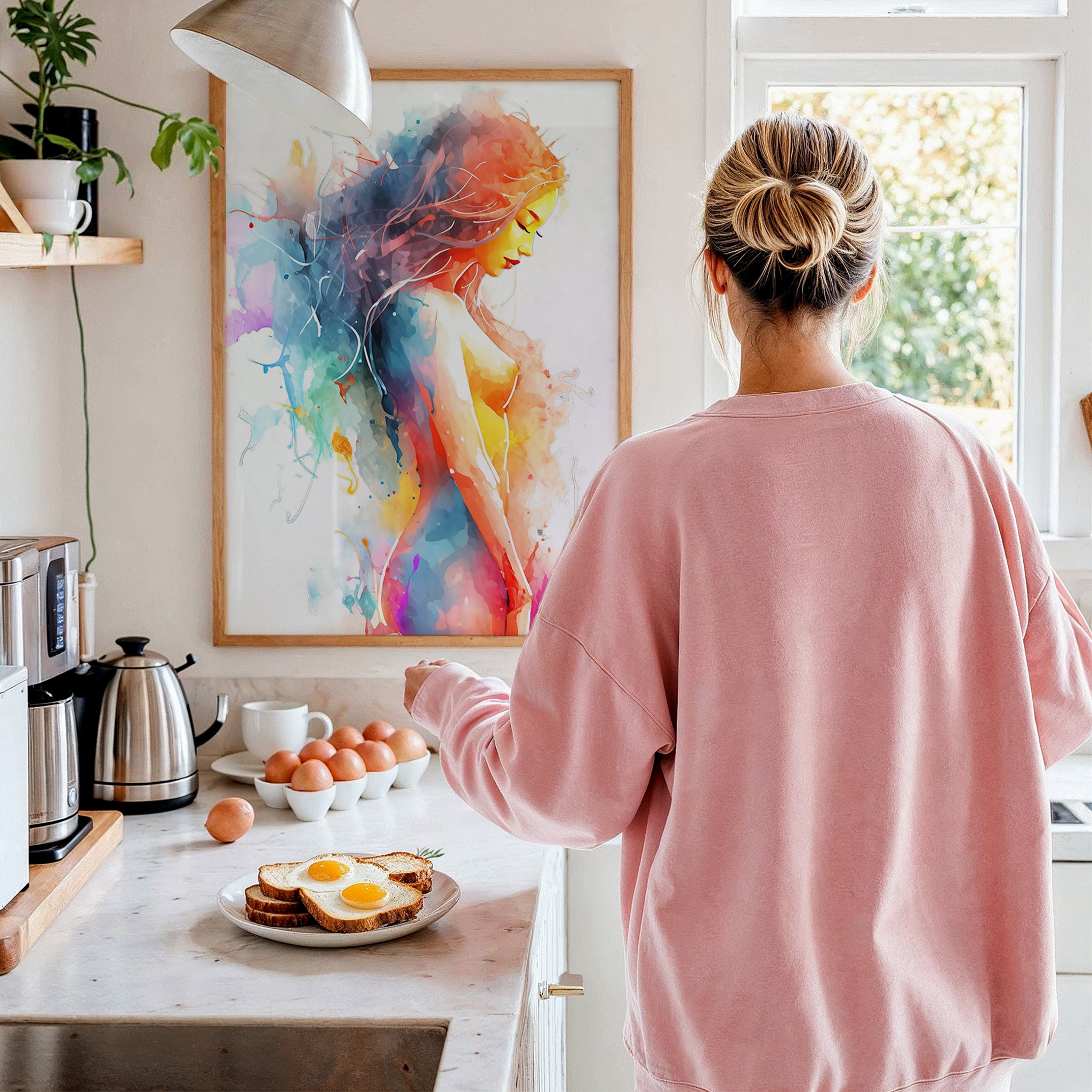 Ember and Aura are a complementary pair that explore the feminine form through vibrant watercolour abstraction. Soft yet powerful, each figure is painted in fluid, luminous tones that blend seamlessly between warmth and coolness. Ember radiates energy and intensity with her fiery palette, while Aura drifts in tranquil pastel hues, evoking calm and introspection.