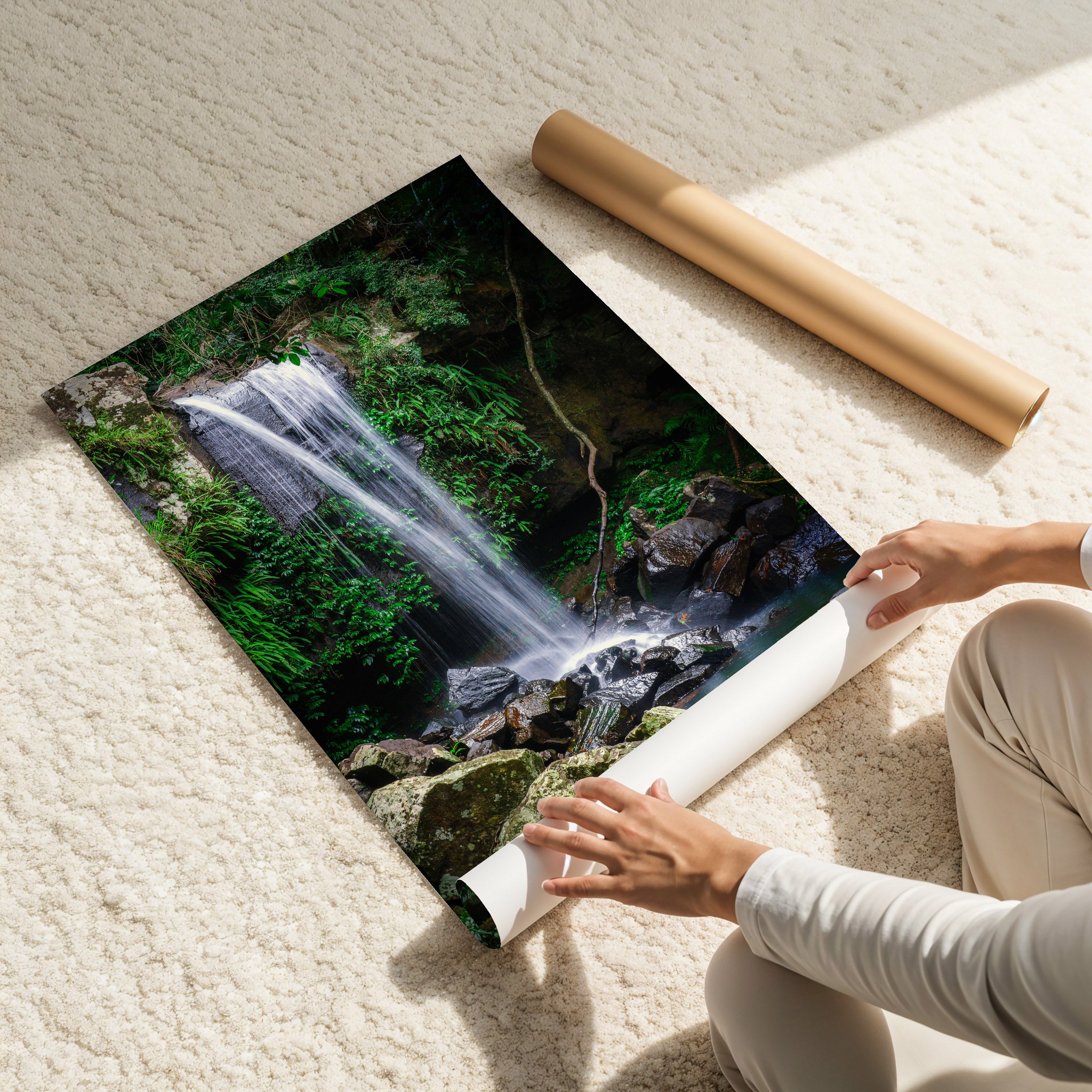 Falling Waters 1 captures the serene beauty of a rainforest waterfall, cascading gently into a tranquil rock pool. Surrounded by lush greenery and moss-covered stones, this artwork brings the calm and refreshing spirit of nature indoors.