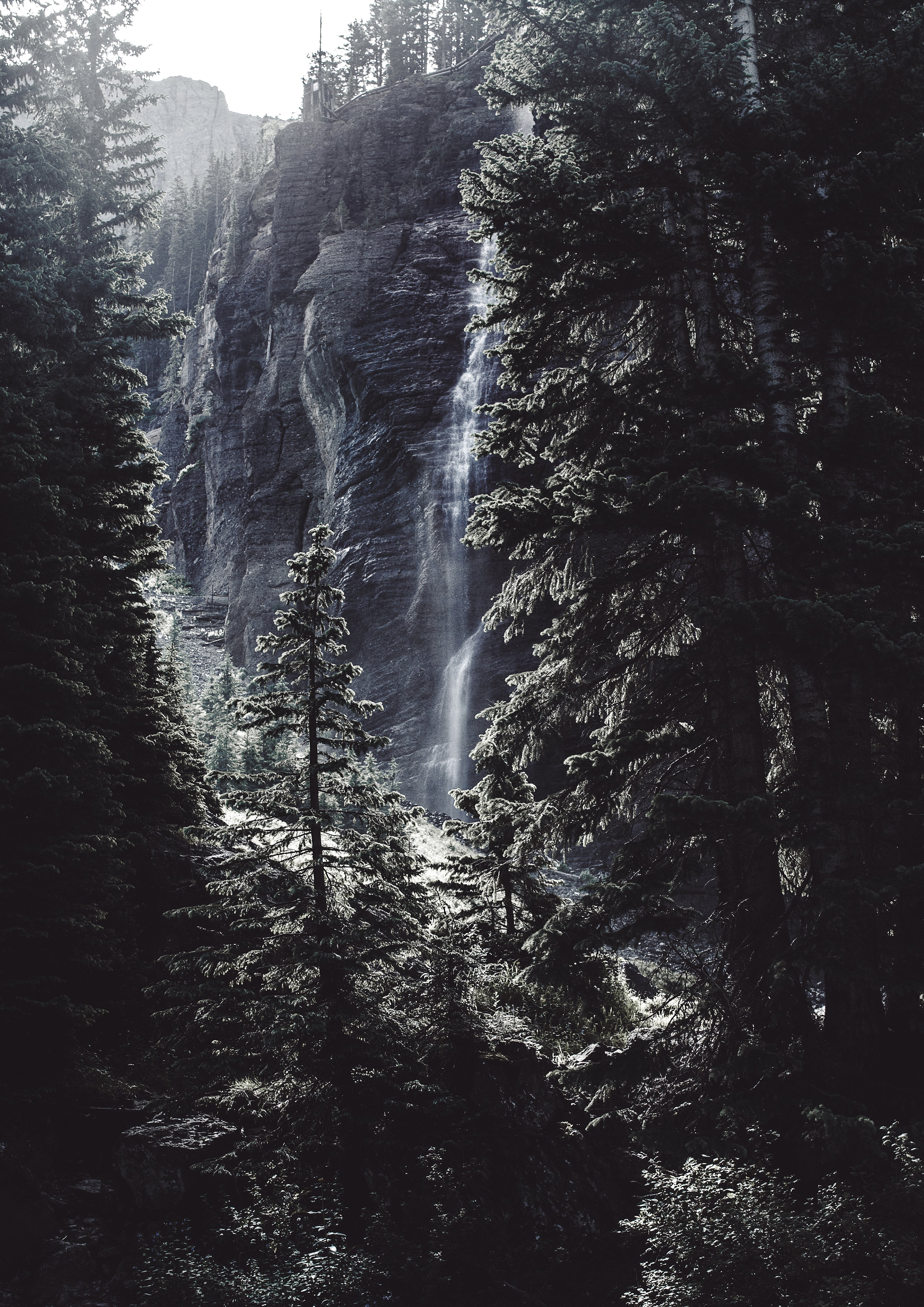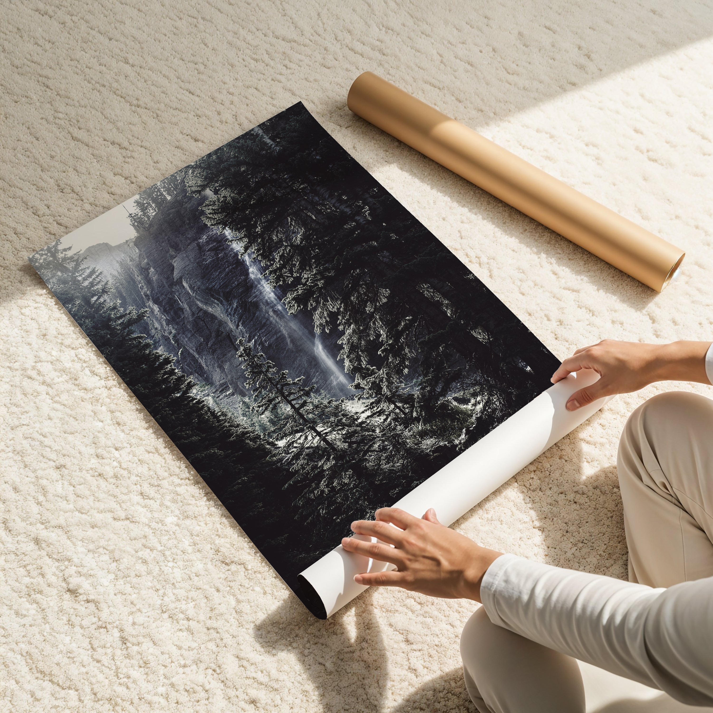 Into The Quiet captures the serene beauty of a hidden waterfall deep within a pine forest. Soft light filters through towering evergreens, highlighting the gentle cascade as it disappears into shadow. The mood is tranquil, contemplative, and almost mystical, making this piece a perfect choice for those who love wilderness landscapes with a sense of stillness and solitude.