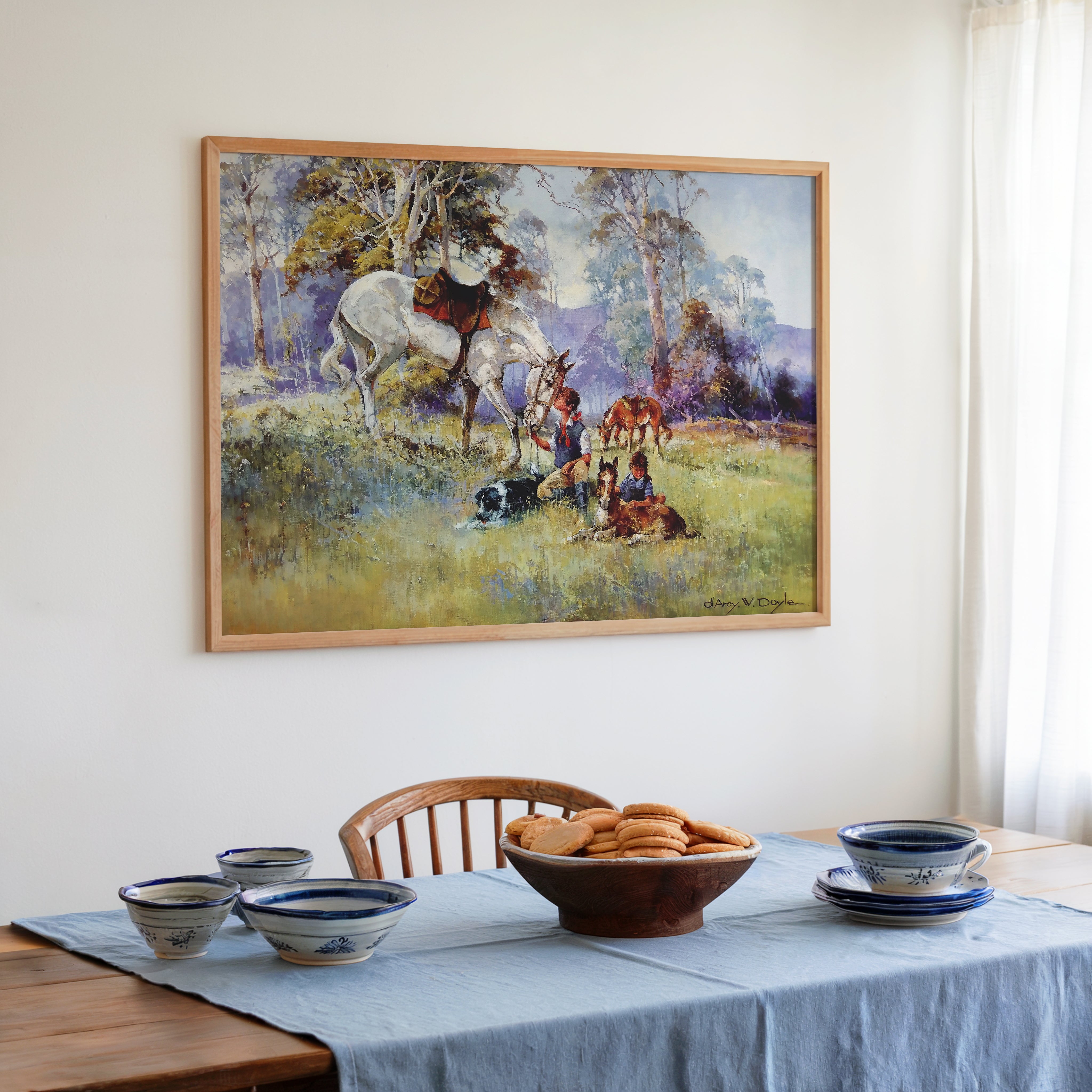 Lost But Found by D’Arcy W. Doyle is a tender depiction of life in the Australian countryside, capturing a quiet moment of connection between people and animals. A young girl and boy rest in a sunlit paddock beside a newborn foal, while a gentle white horse bends to greet them. The soft purples, greens, and golden tones of the bush create a serene backdrop, filled with Doyle’s trademark warmth and nostalgia.