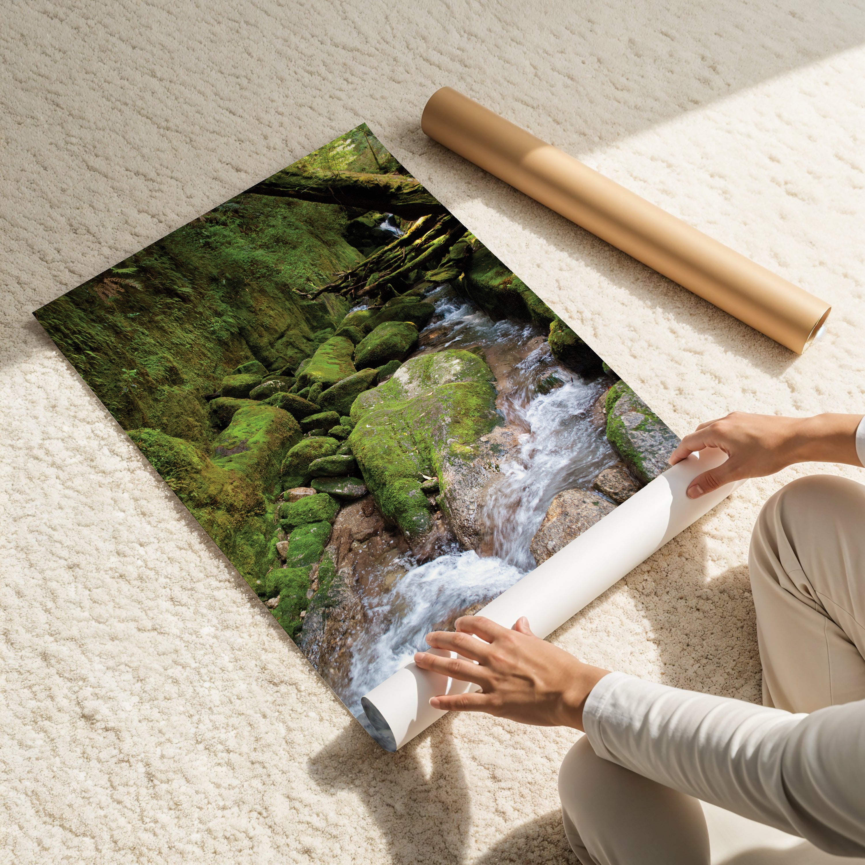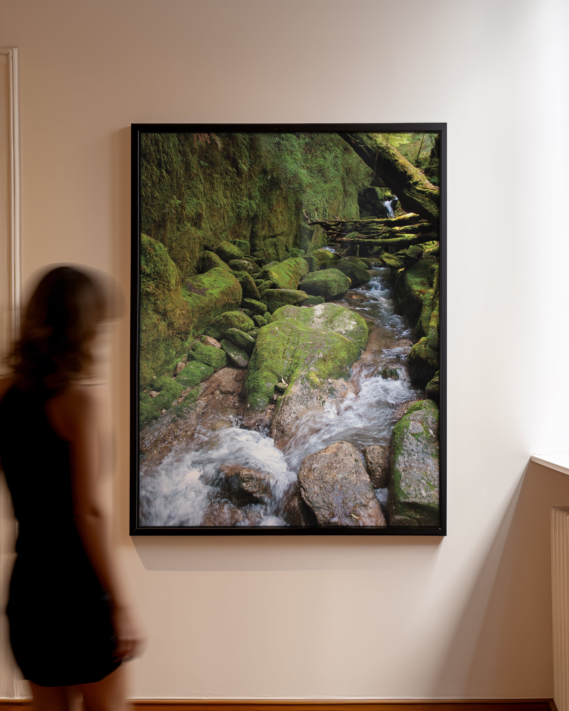Mossy Stream is a tranquil artwork that captures the beauty of a forest creek winding its way through lush green rocks and fallen branches. The rich moss tones and flowing water create a sense of calm and renewal, evoking the timeless rhythm of nature.