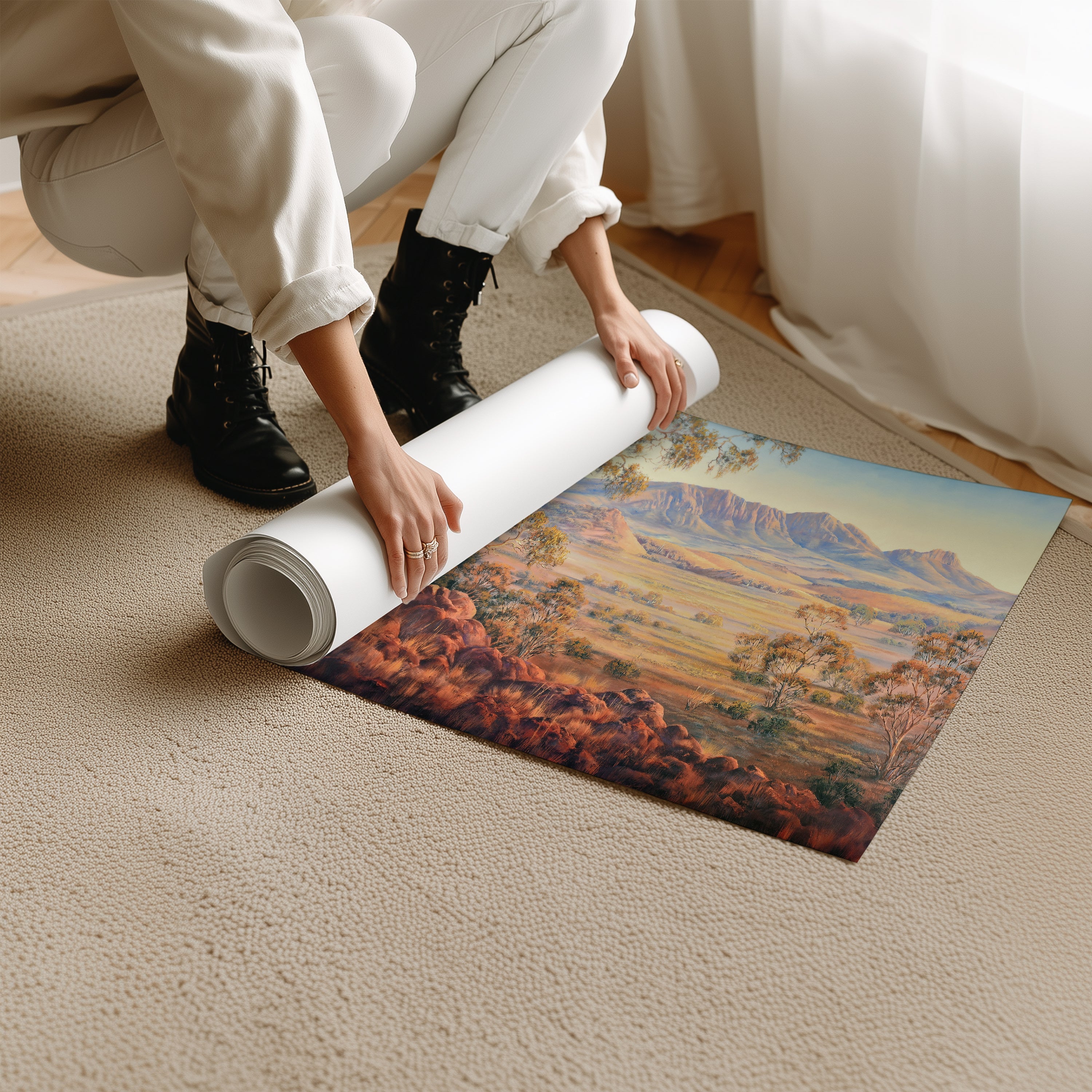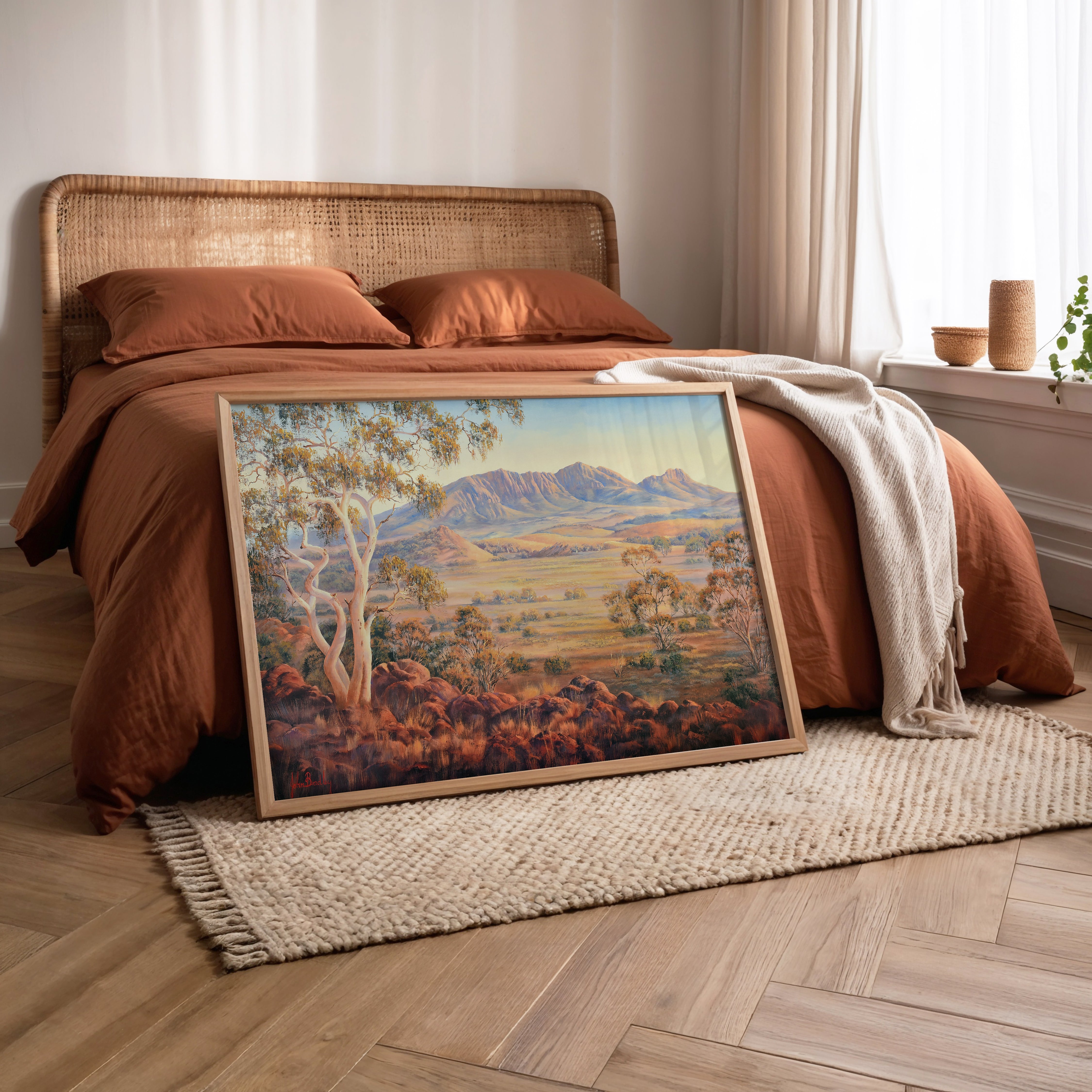 Mount Sonder by John Bradley captures the vast, timeless beauty of Australia’s Red Centre. The artwork looks across a sweeping desert plain toward the rugged silhouette of the West MacDonnell Ranges, bathed in the warm glow of morning light. The ghost gums and red rocks in the foreground shimmer with delicate tones of gold, rust, and soft mauve — a tribute to the heart of the outback.