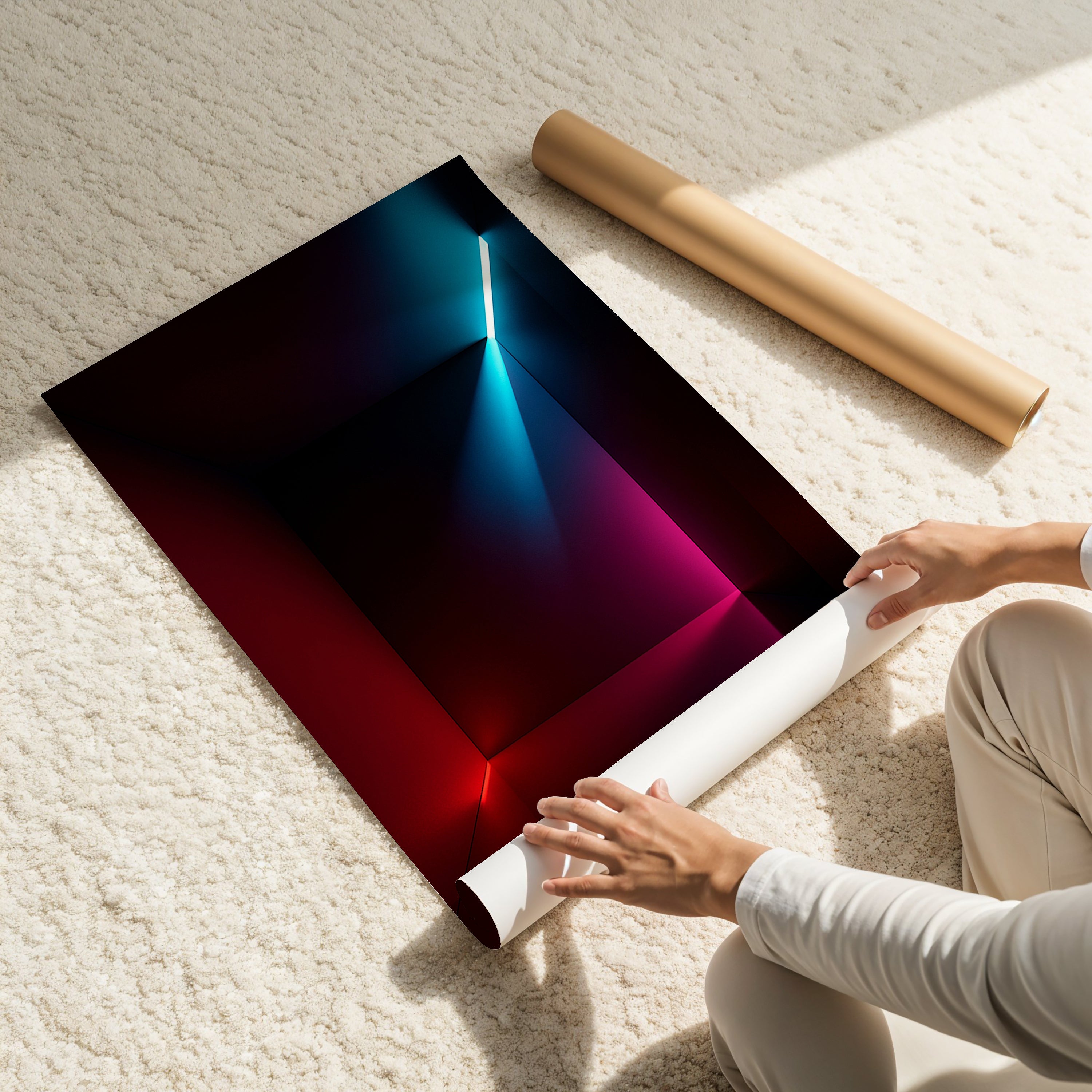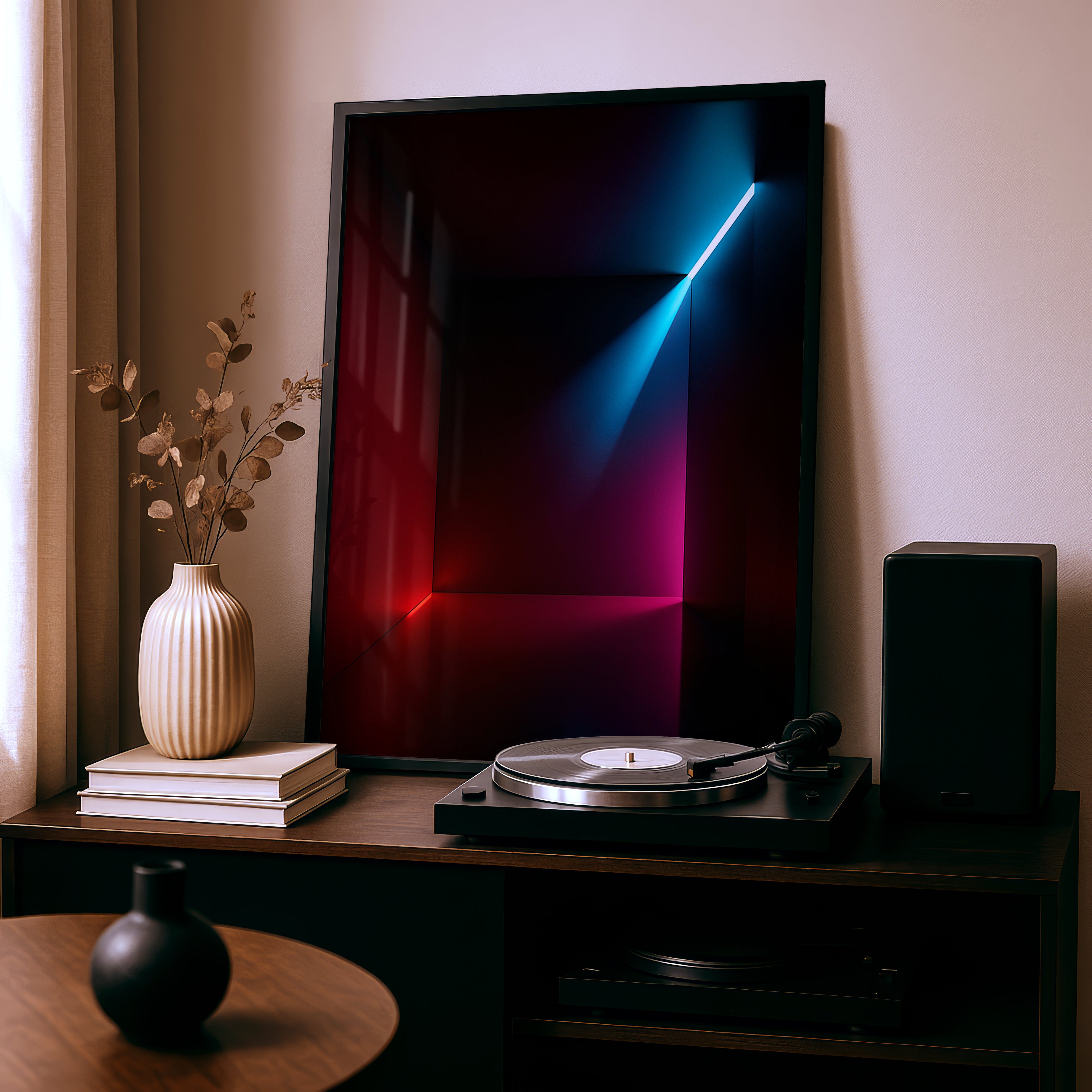 Part of the Chromatic Constructs series, Presence reflects a meditative focus on form, shadow and energy. Ideal for modern interiors, architectural environments or creative studios that embrace bold minimalism.