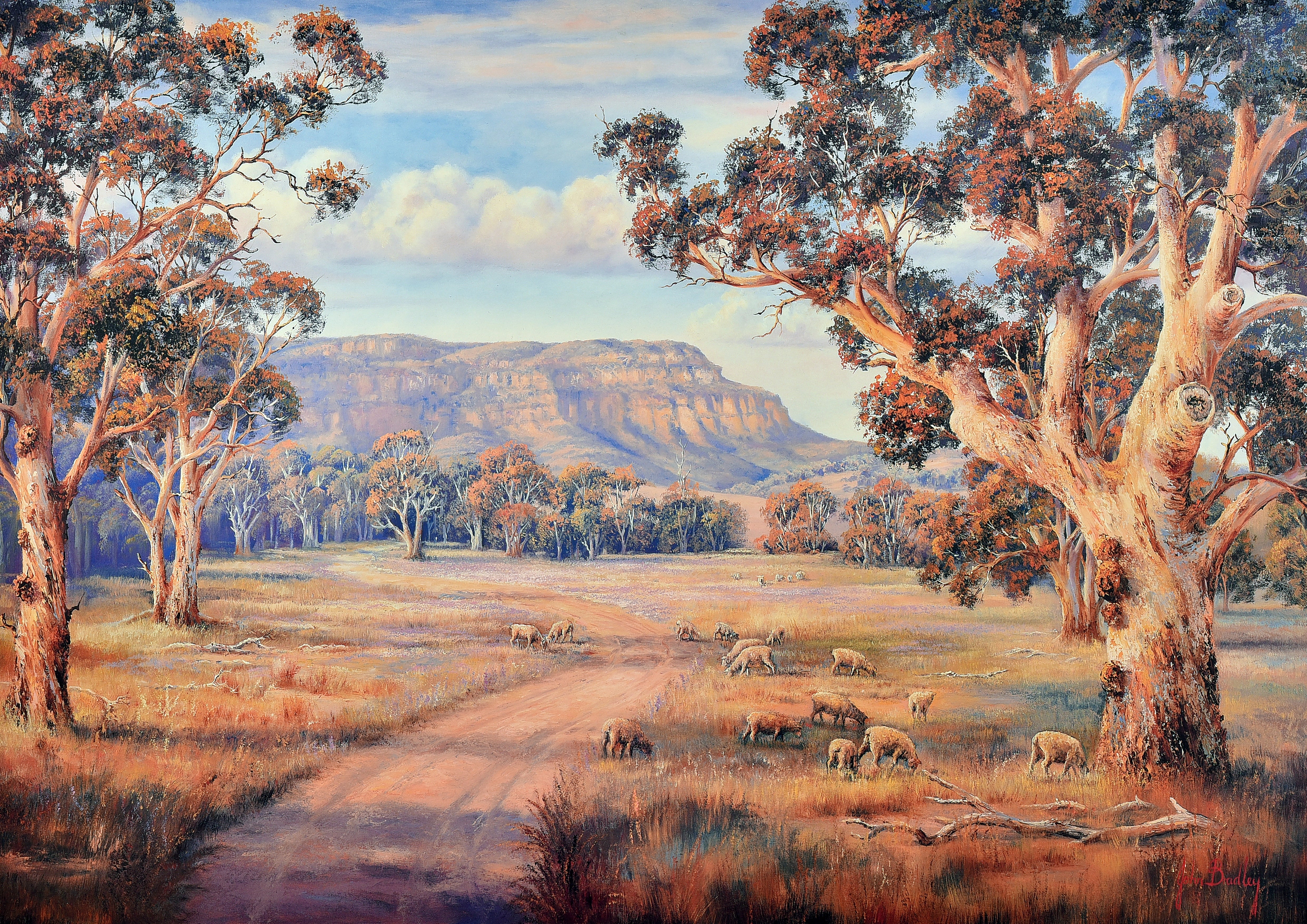 Rawnsley Bluff by John Bradley captures the timeless beauty of the Flinders Ranges — a place where Australia’s rugged landscape meets pastoral calm. Bathed in soft afternoon light, the painting reveals grazing sheep beneath towering red gums, framed by the ochre cliffs of Rawnsley Bluff in the distance. Bradley’s brushwork celebrates the textures of bark, dust, and sky, bringing to life the quiet resilience and grandeur of the Australian bush.
