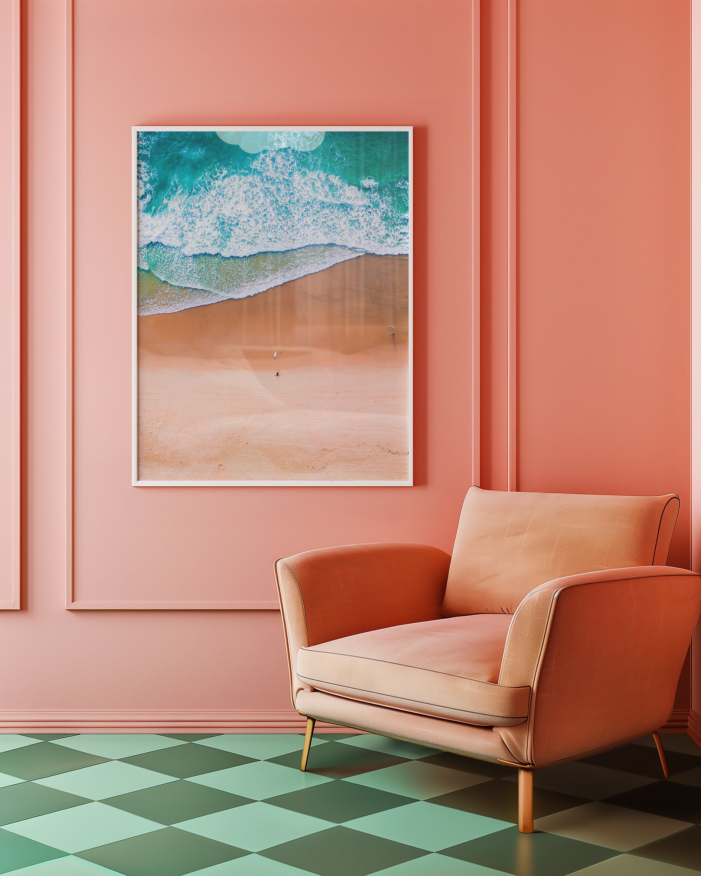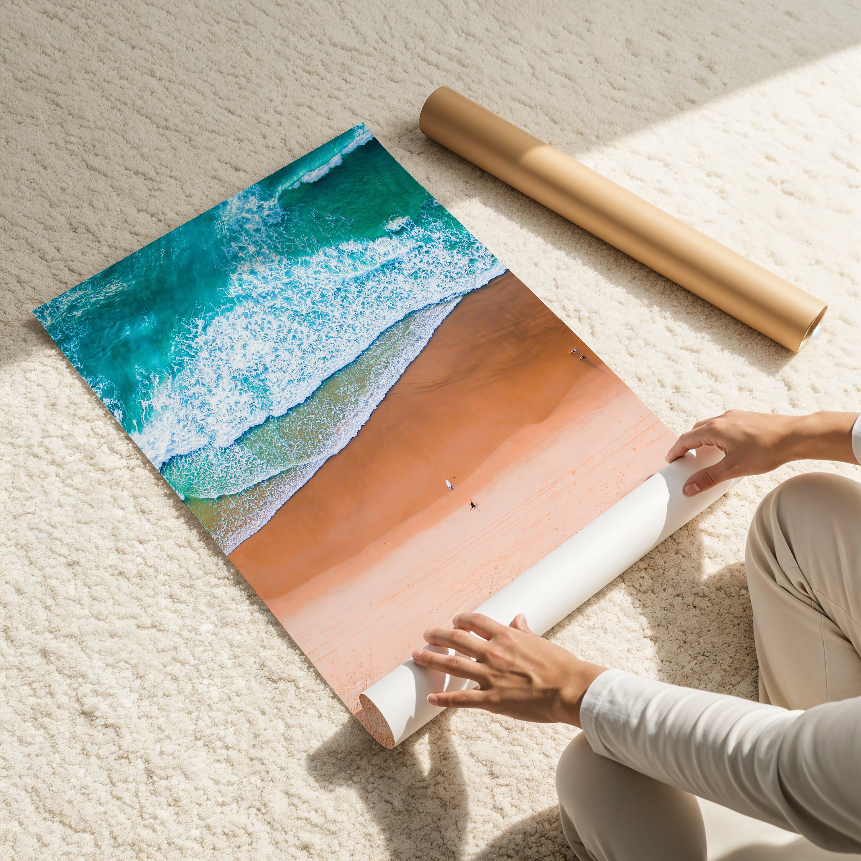 Shoreline is a breathtaking aerial photograph that captures the meeting point of land and sea in vibrant detail. The turquoise waves roll across golden sands, creating a striking composition that feels both calming and invigorating. The perspective highlights the sheer beauty of Australia’s coastline, making it a statement piece for coastal, modern, or minimalist interiors.