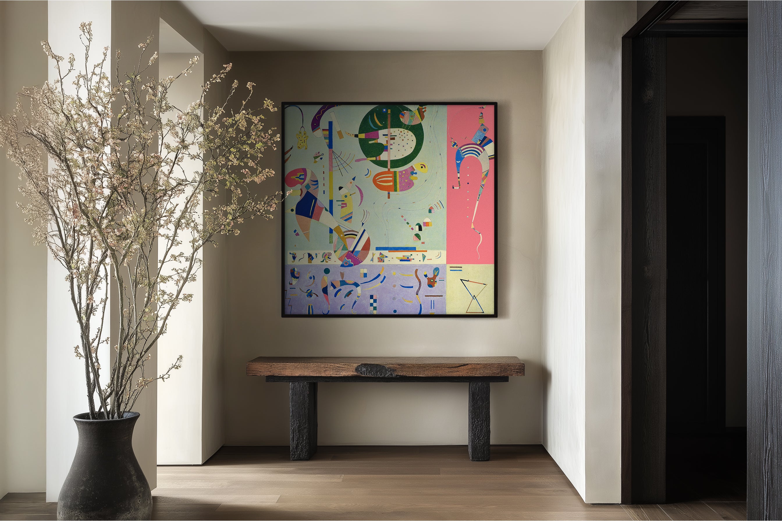 Soft Hard is a vibrant abstract composition inspired by the work of Wassily Kandinsky. Geometric shapes, sweeping curves, and playful bursts of colour come together in rhythmic balance. The artwork’s pastel base contrasts with rich accents of coral, green, blue, and gold, creating both tension and harmony — the “soft” and “hard” of its name.