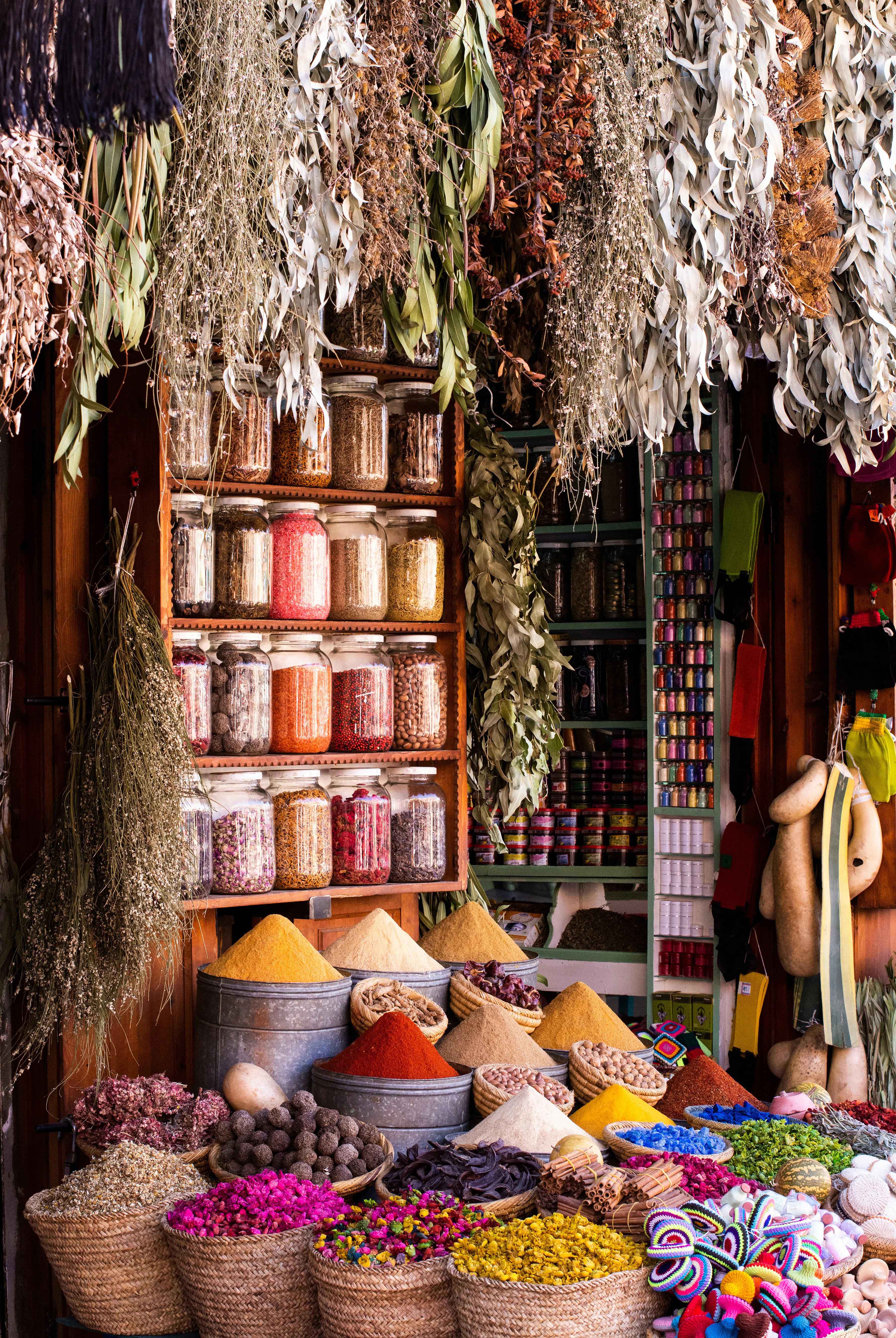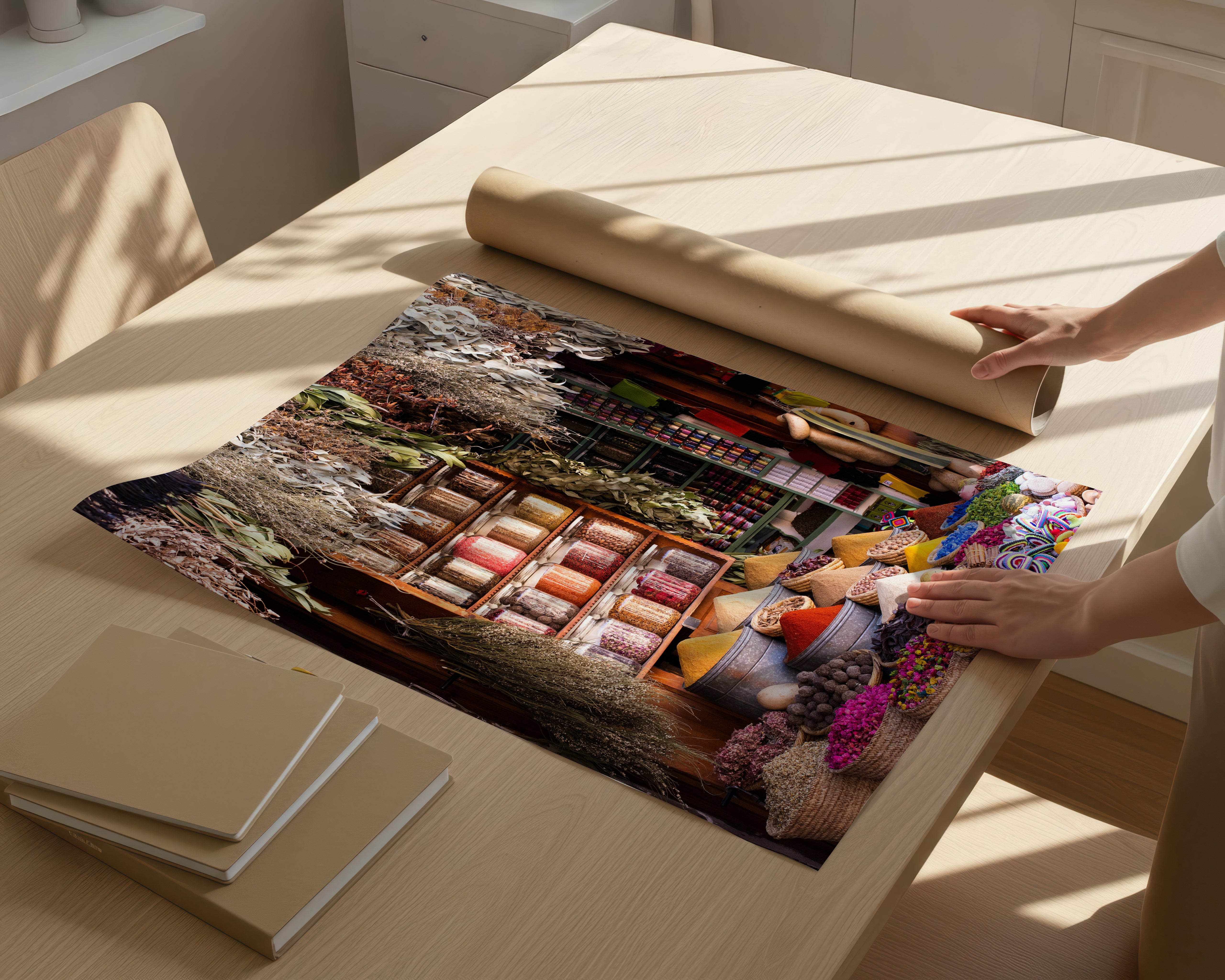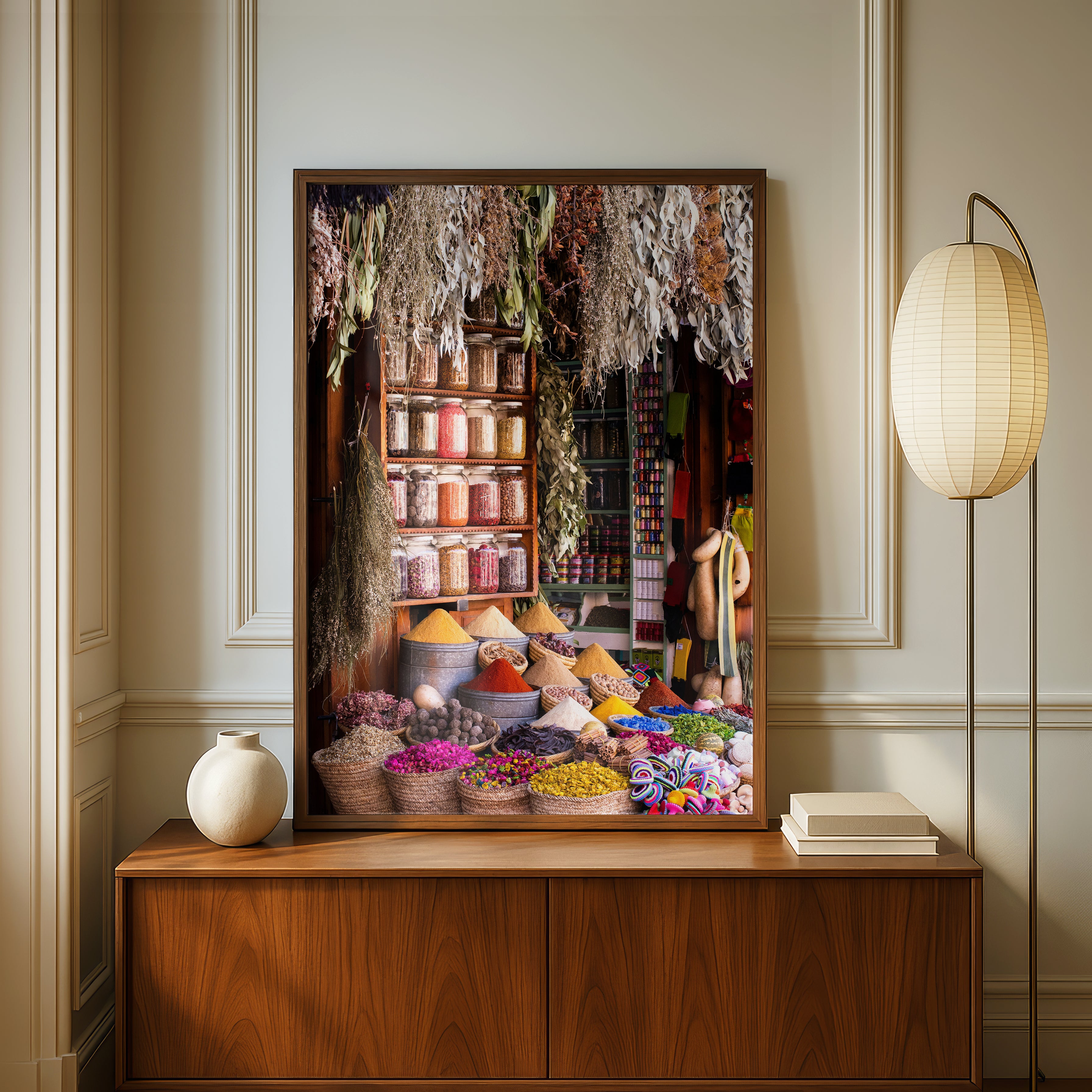 Souk of Spices is full of life. A wall of jars, dried herbs hanging overhead, woven baskets piled high with pigments and spices that spill into the frame. Warm tones, texture everywhere, and a sense of movement like the air smells of cardamom and heat.