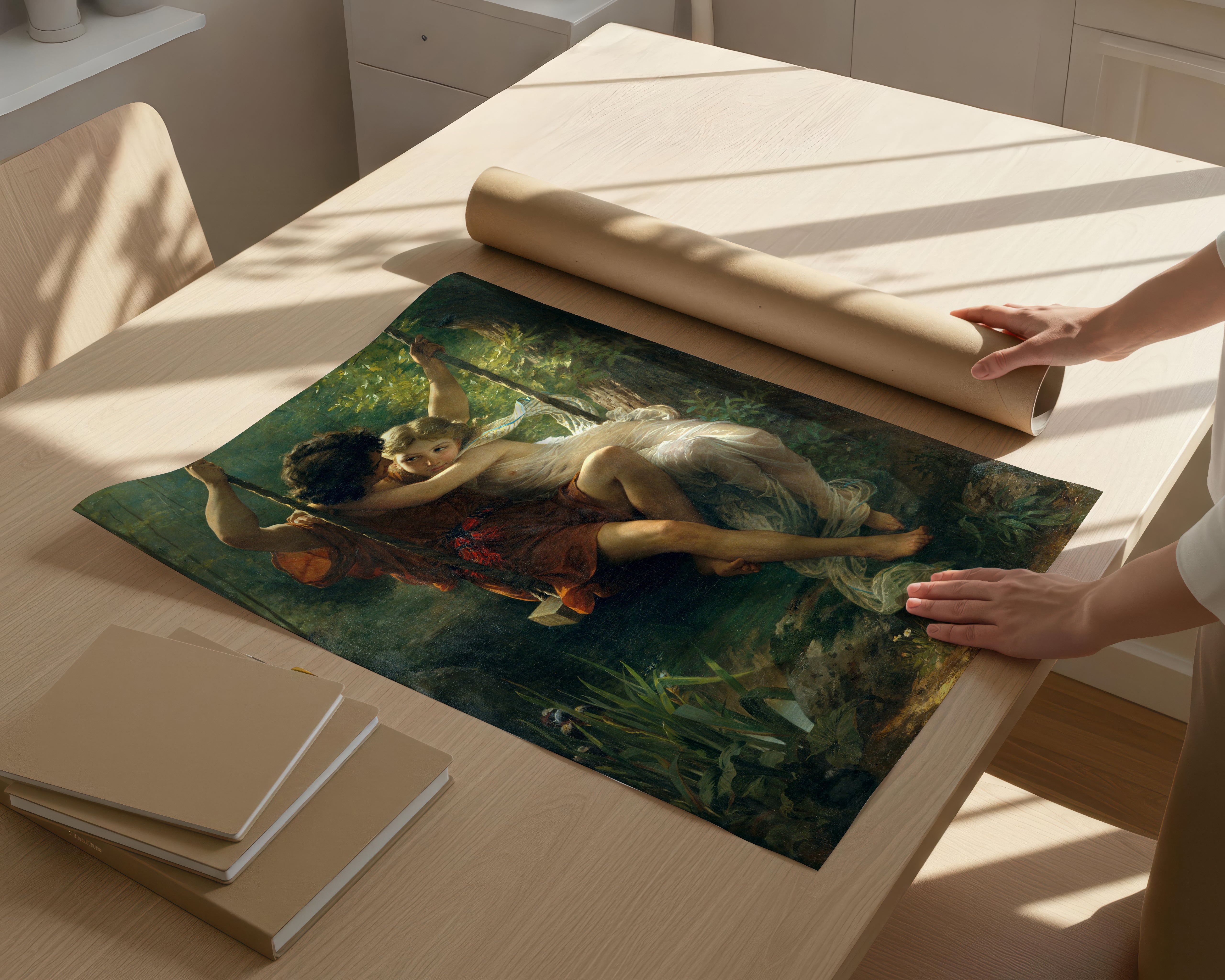 Painted in 1873 by French artist Pierre-Auguste Cot, a celebrated figure of the Academic tradition, the piece reflects his signature style of idealised beauty, soft realism, and classical storytelling. Cot was a student of both William-Adolphe Bouguereau and Alexandre Cabanel, and his work sits firmly within the romantic mythology of late-19th-century French art.