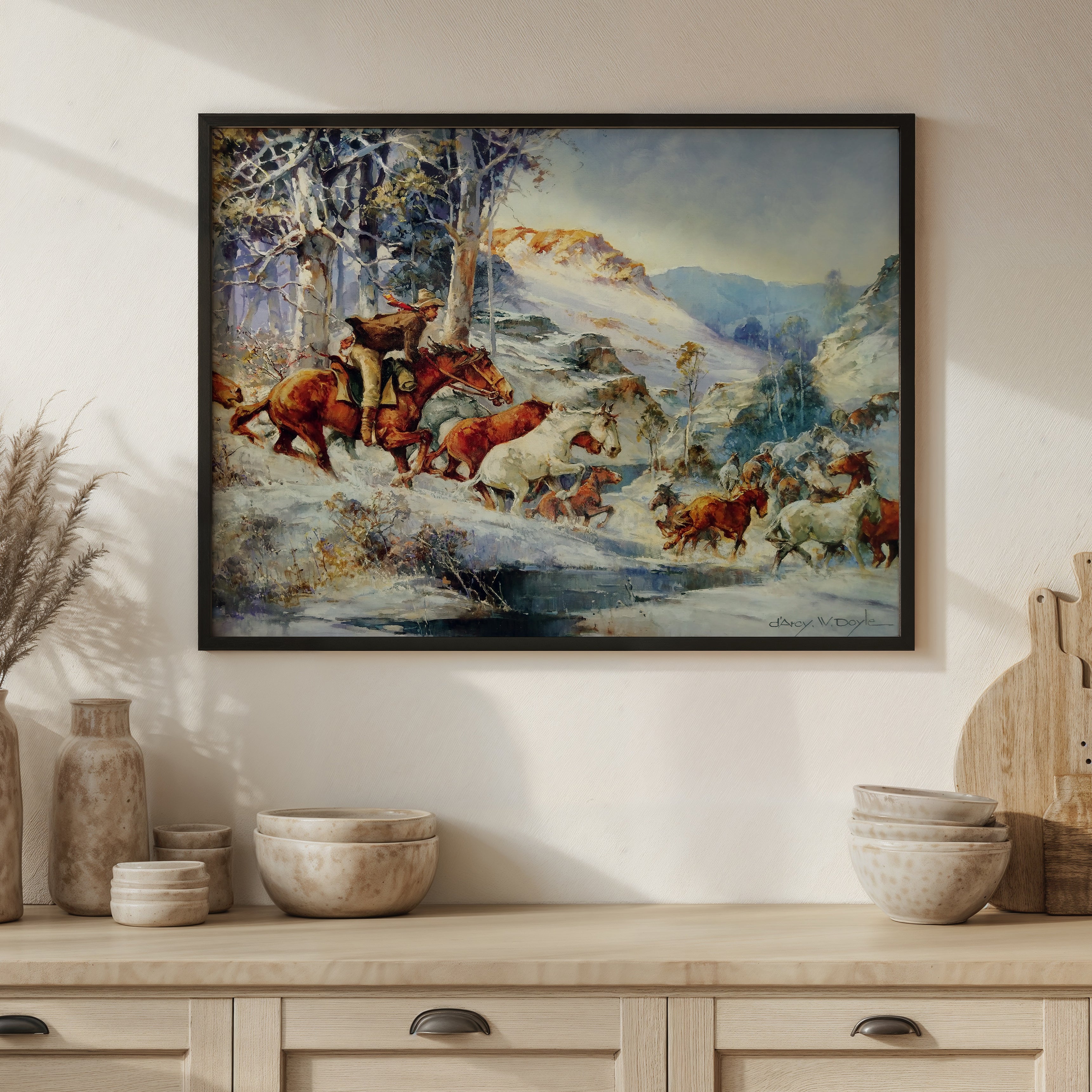 Stockman’s Image by D’Arcy W. Doyle captures the raw courage and endurance of Australian stockmen braving the harsh winter landscape. Set against a snow-covered mountain range, the scene bursts with movement as riders and horses push through icy terrain, their strength and determination unwavering. The warmth of the chestnut horses contrasts beautifully with the cool blues and whites of the snow, highlighting Doyle’s masterful use of colour and light.