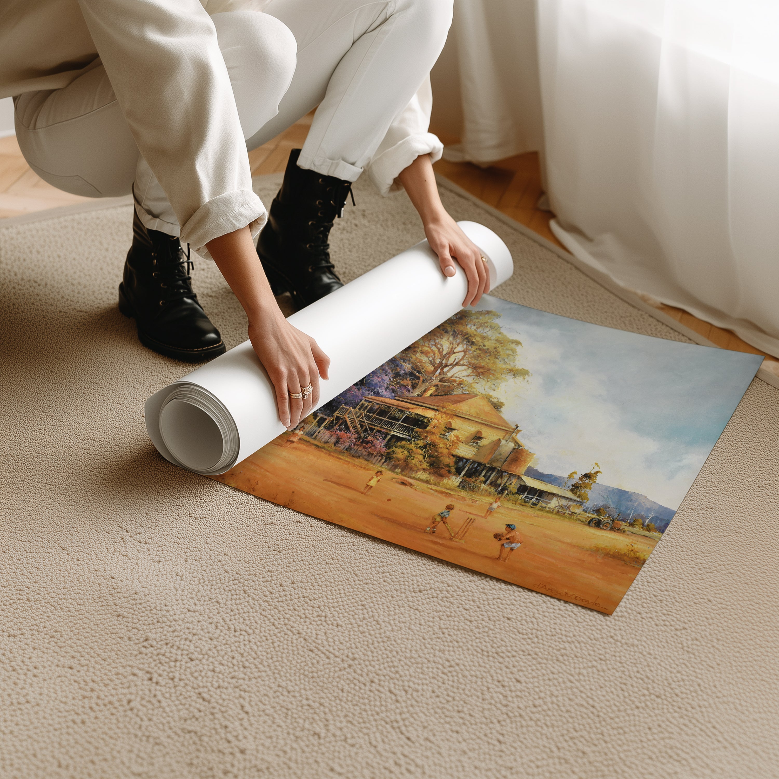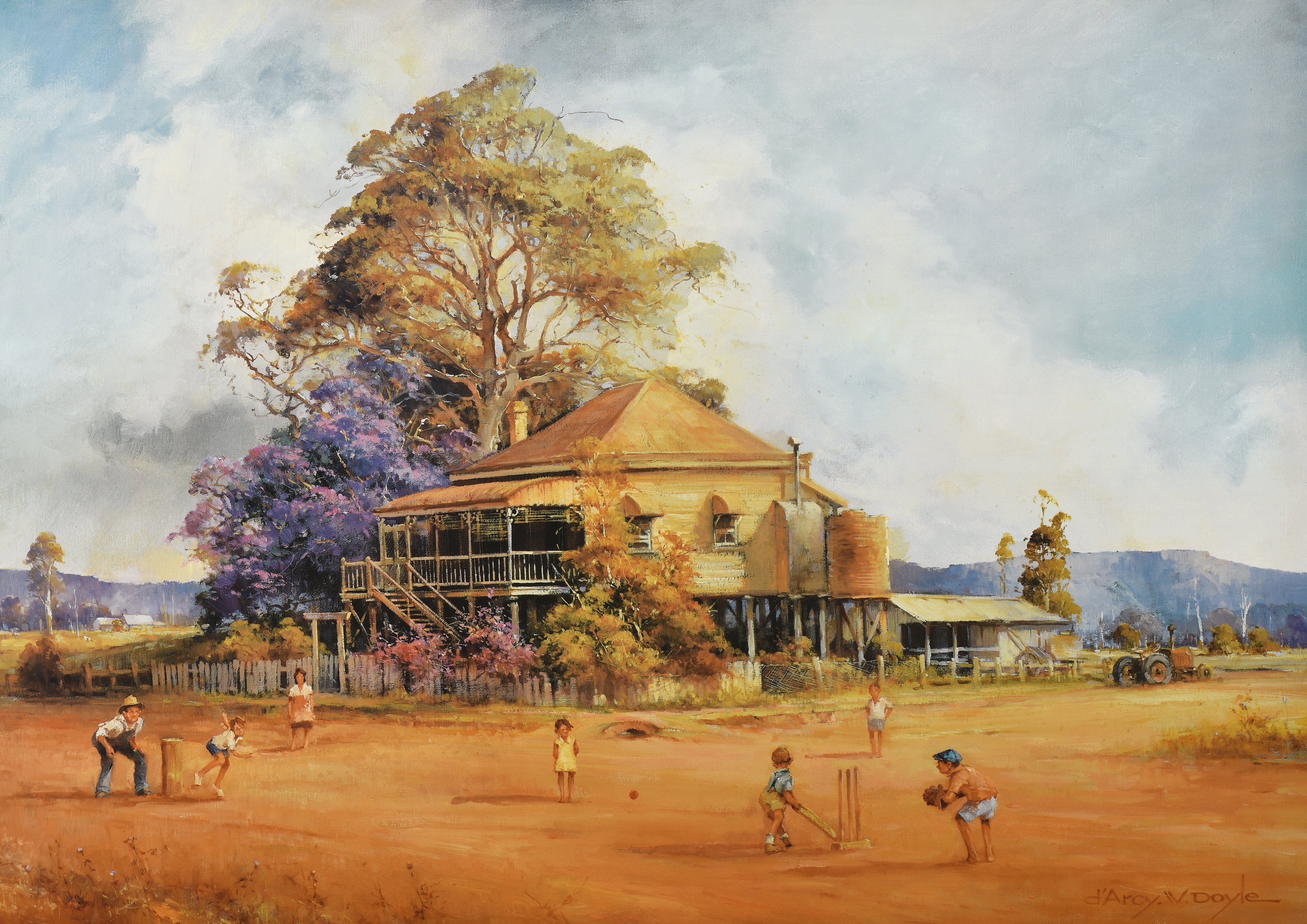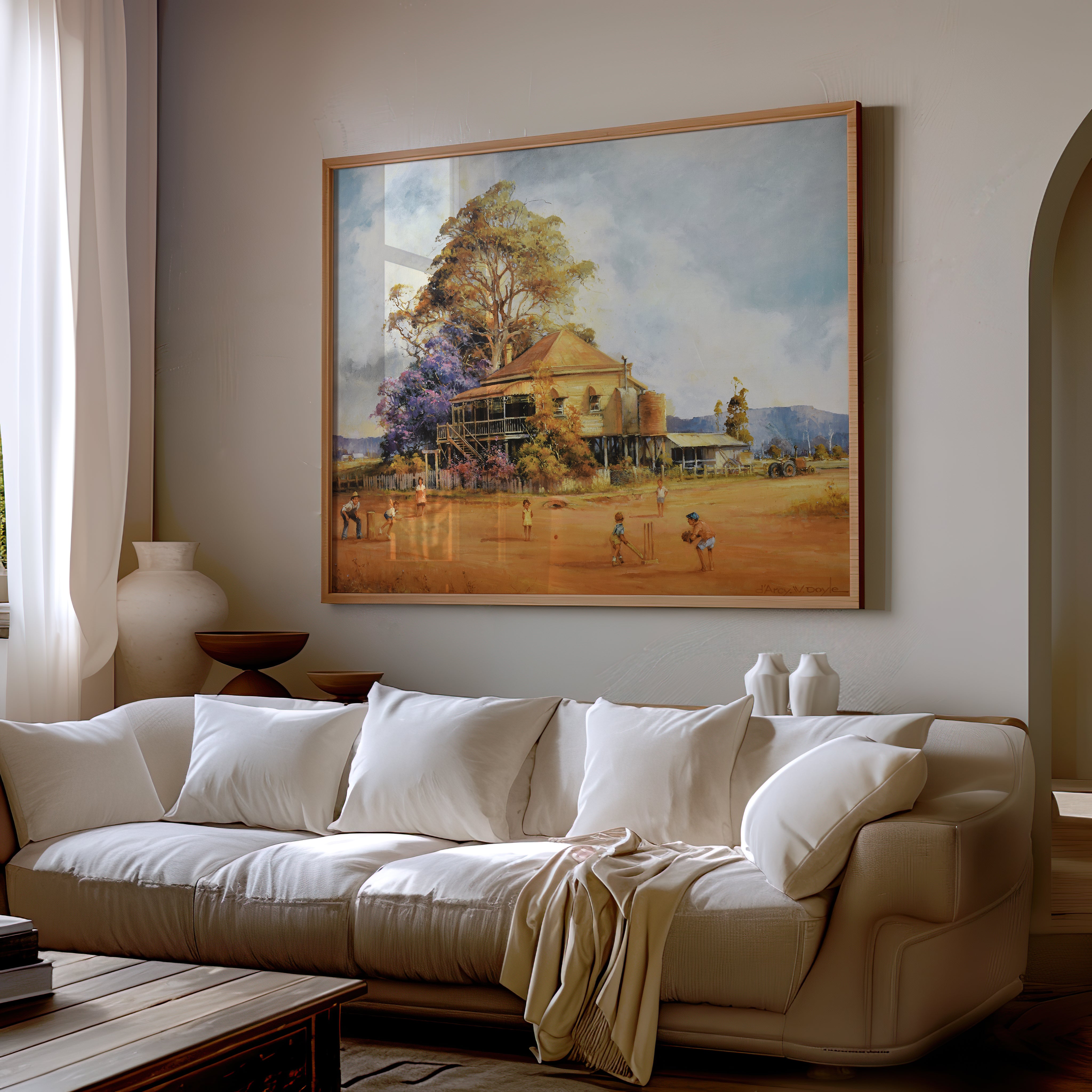 Taking It Seriously by D’Arcy W. Doyle is a quintessential slice of Australian life — a group of kids playing backyard cricket under the summer sun, with the old Queenslander house standing proudly in the background. The golden dust, the jacaranda blooms, and the playful seriousness of the game capture a timeless nostalgia that every Australian can relate to.