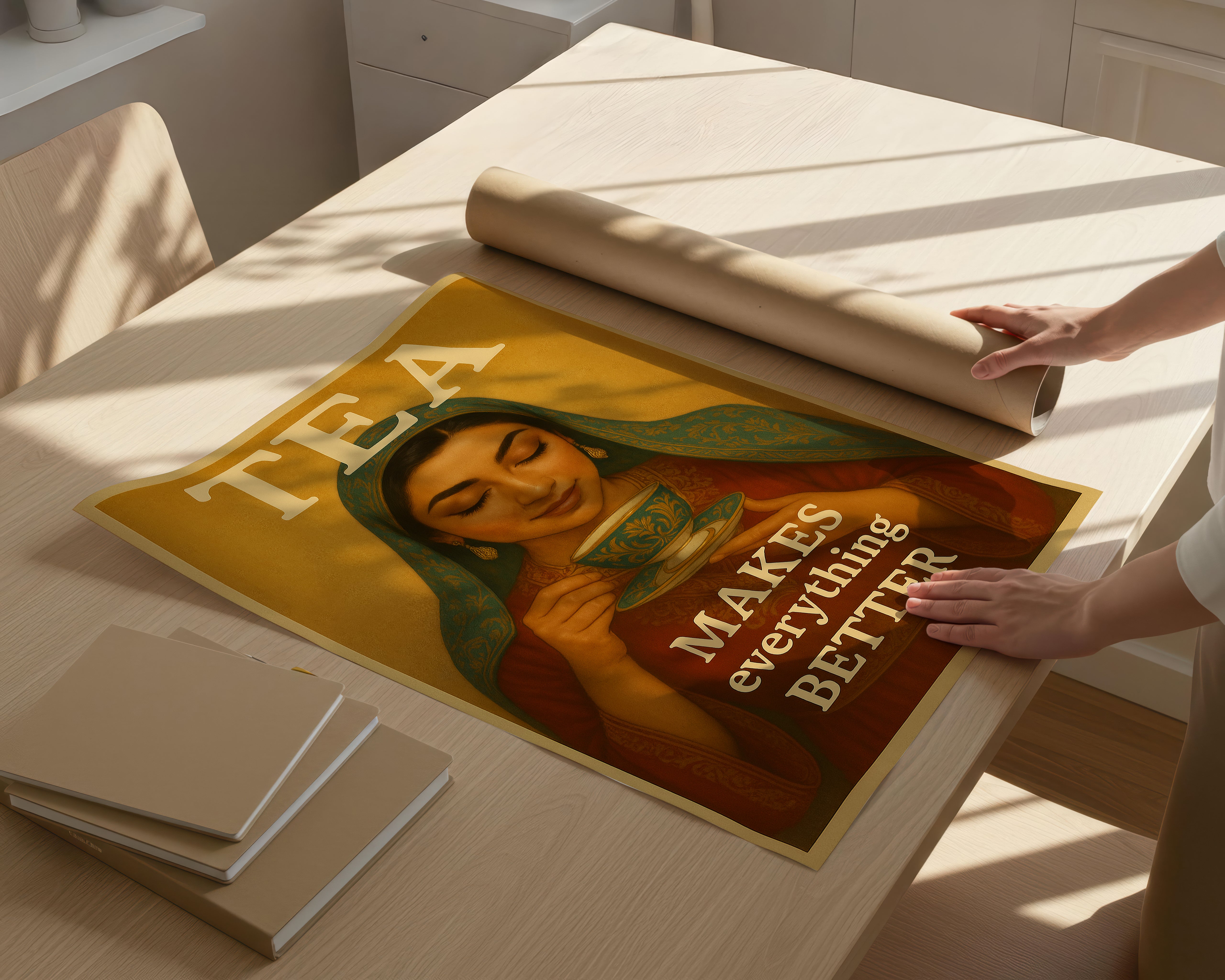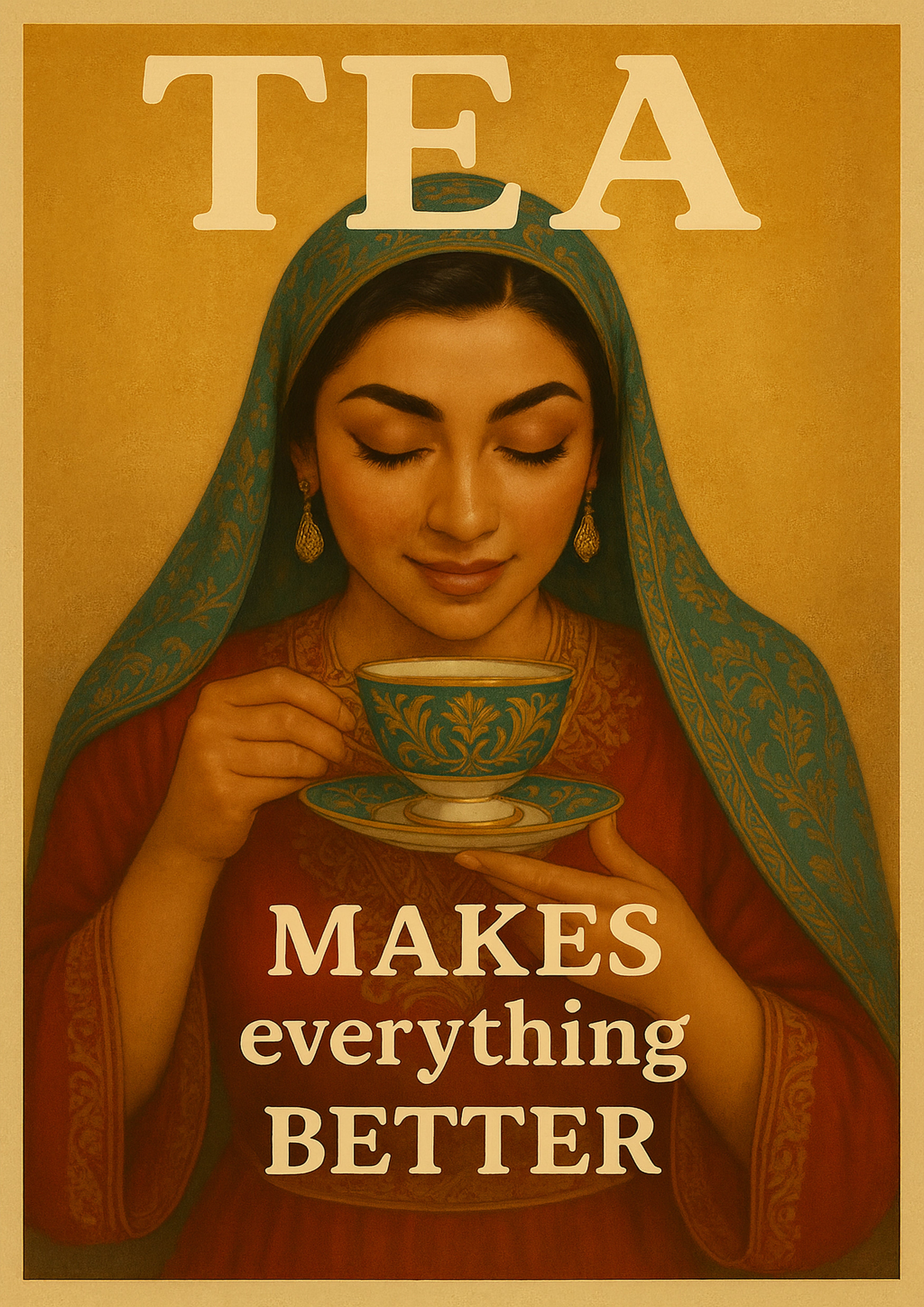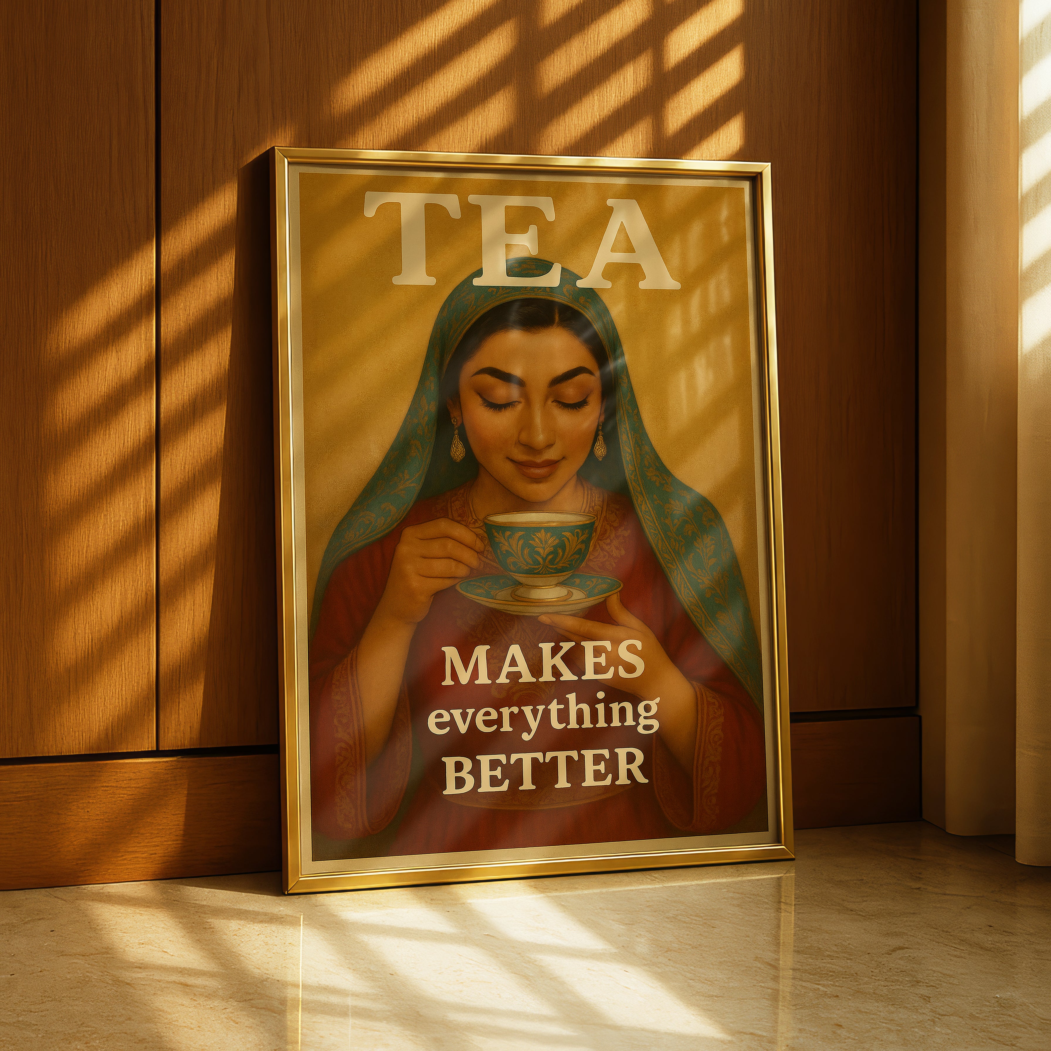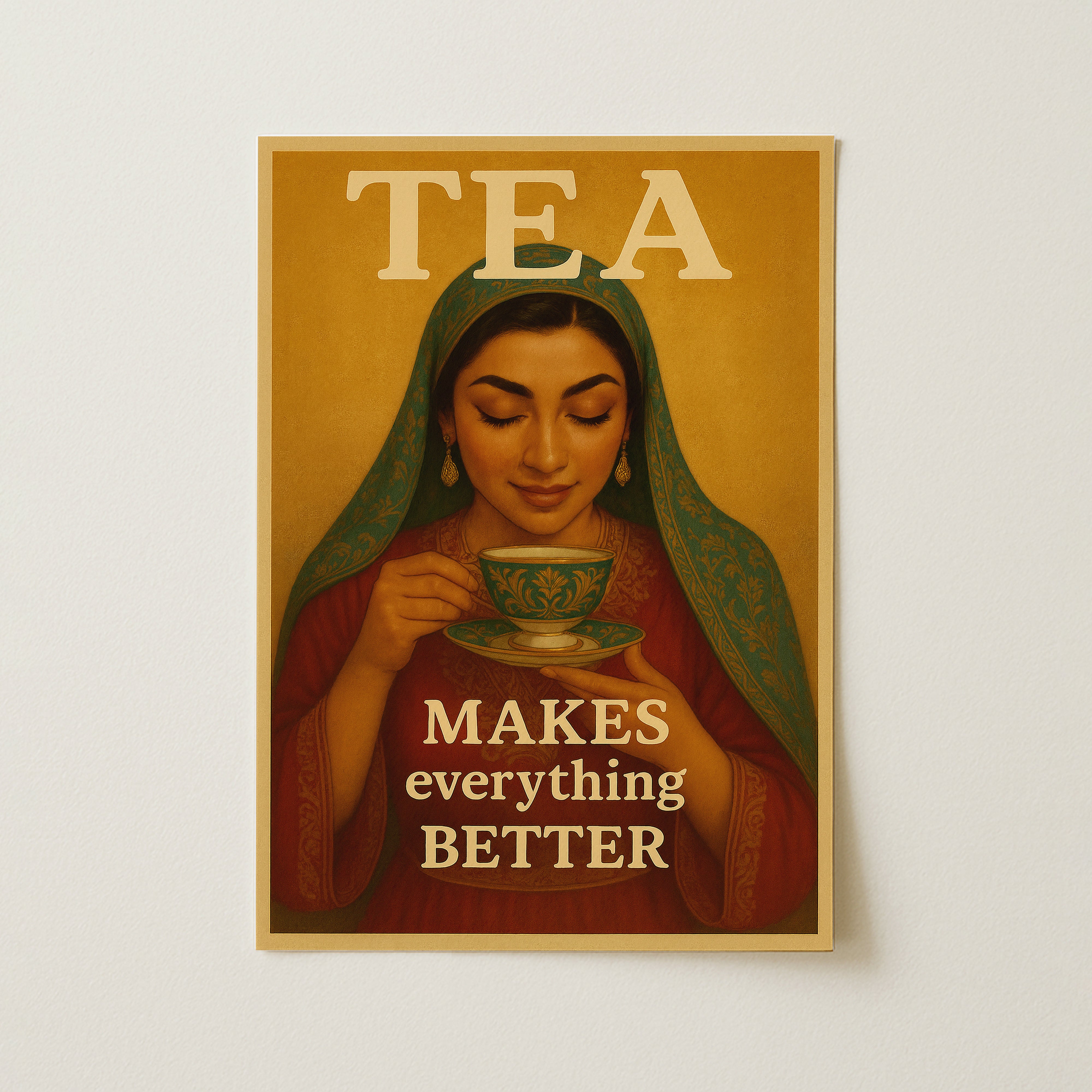Tea Makes Everything Better features a Persian woman in a moment of quiet appreciation, holding an ornate teacup with graceful composure. The rich textiles, gold accents, and warm palette create a timeless portrait that celebrates culture, ritual, and the simple joy of pausing for tea. It is part of a broader series depicting women from diverse cultural backgrounds, each honouring the universal comfort of tea.