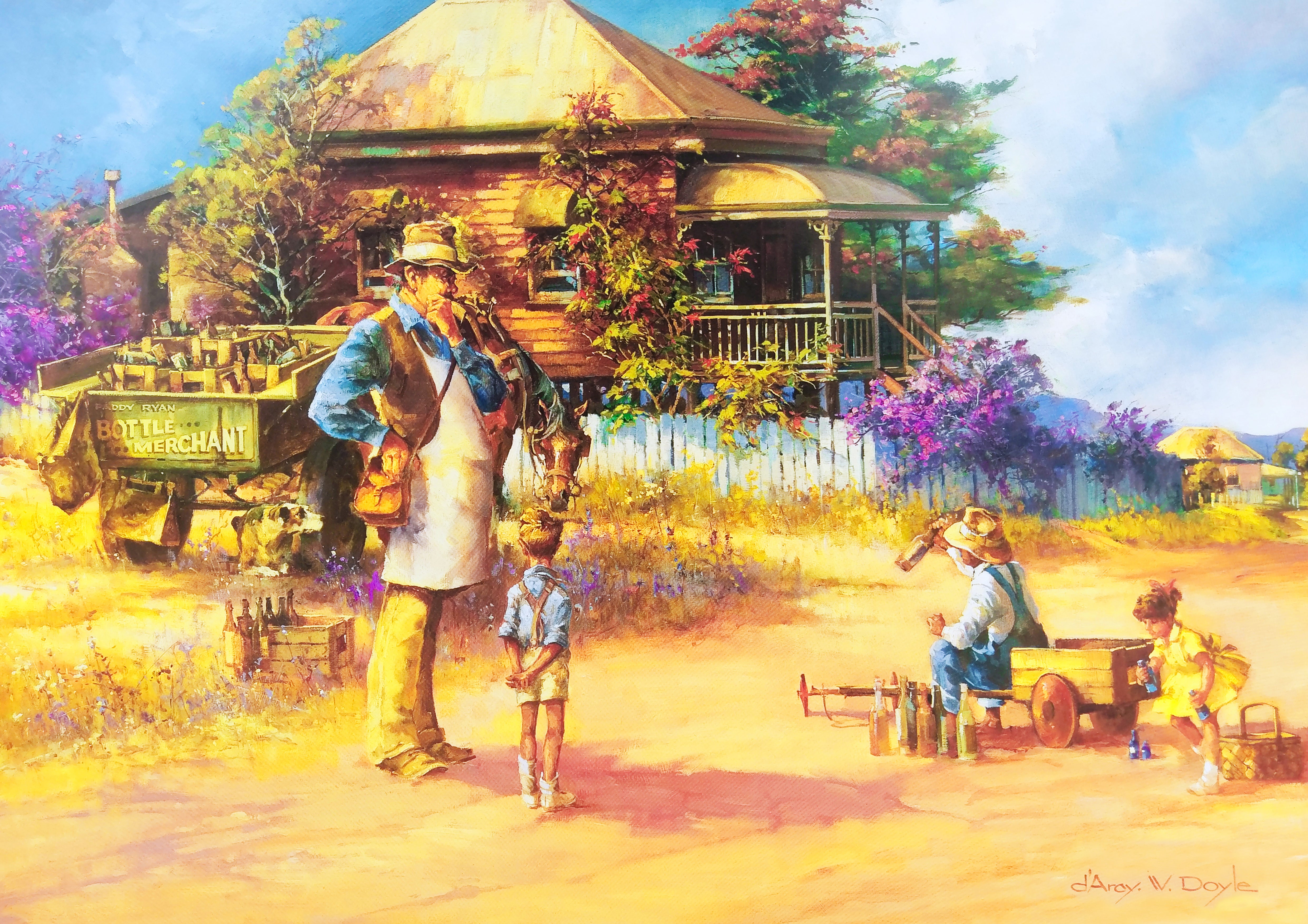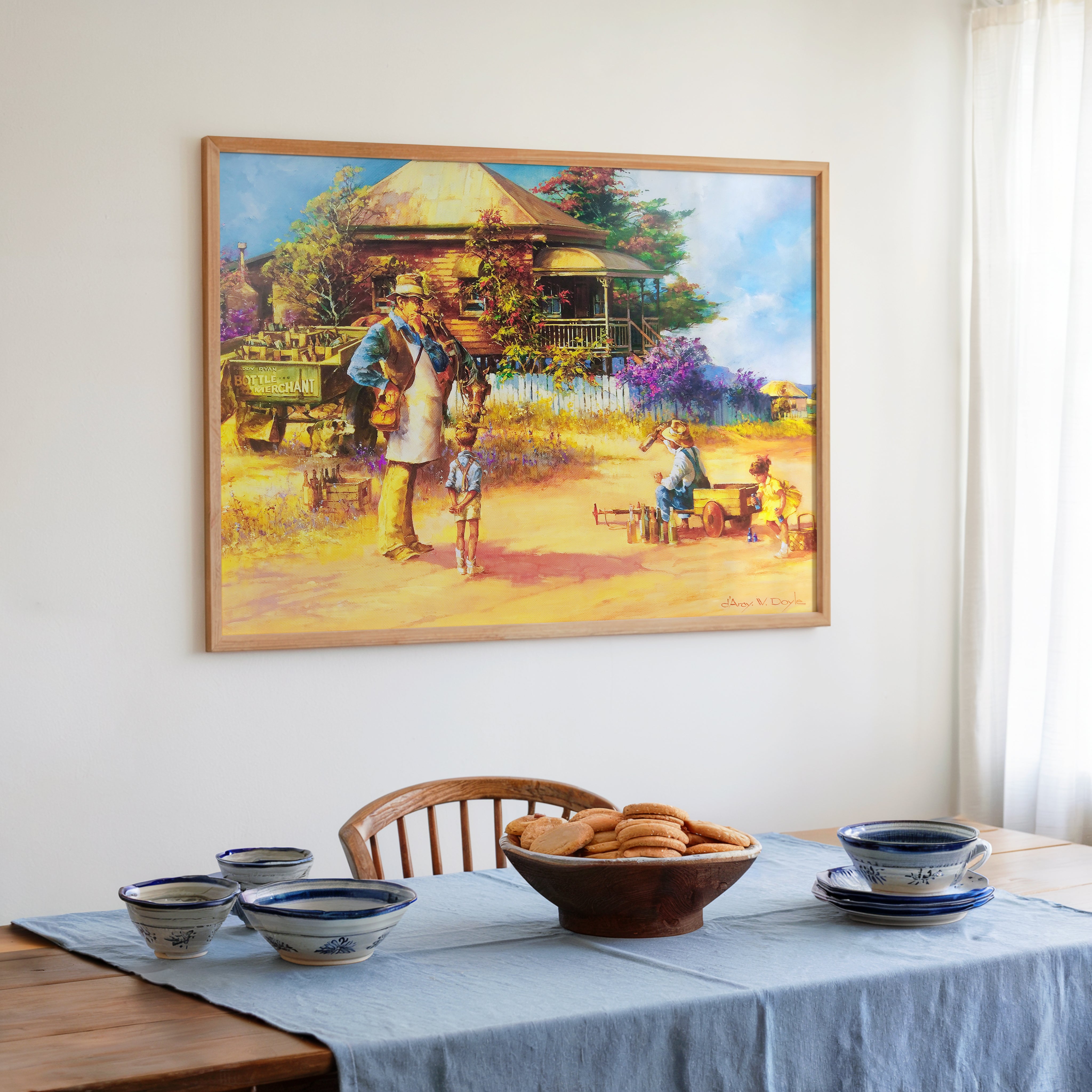 Doyle’s signature storytelling style is filled with light, humour and affection. Every detail — from the horse-drawn cart to the kids playing in the dust — speaks to the heart of old Australia. This timeless artwork adds colour, charm and character to any home, especially those who love Australiana or vintage nostalgia.