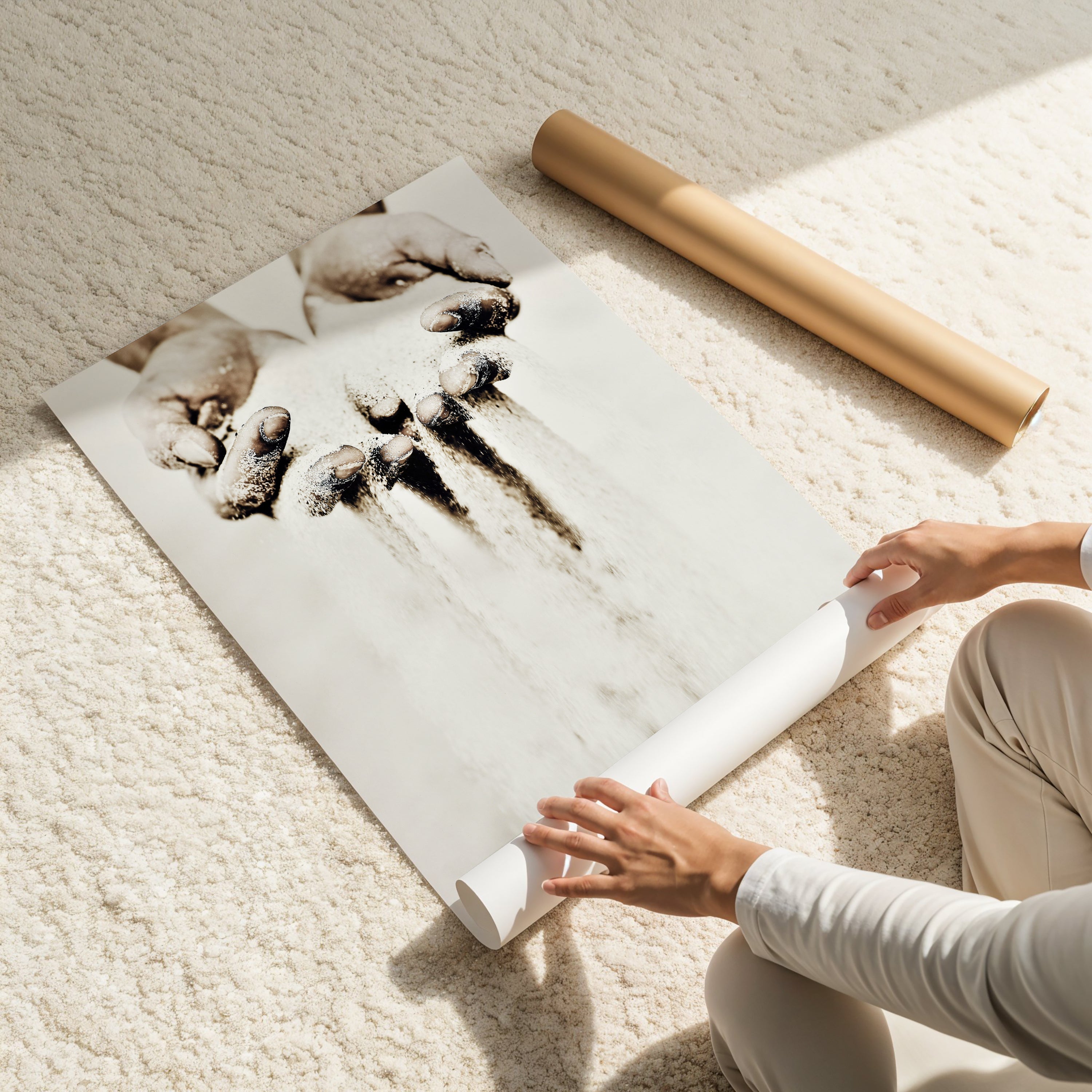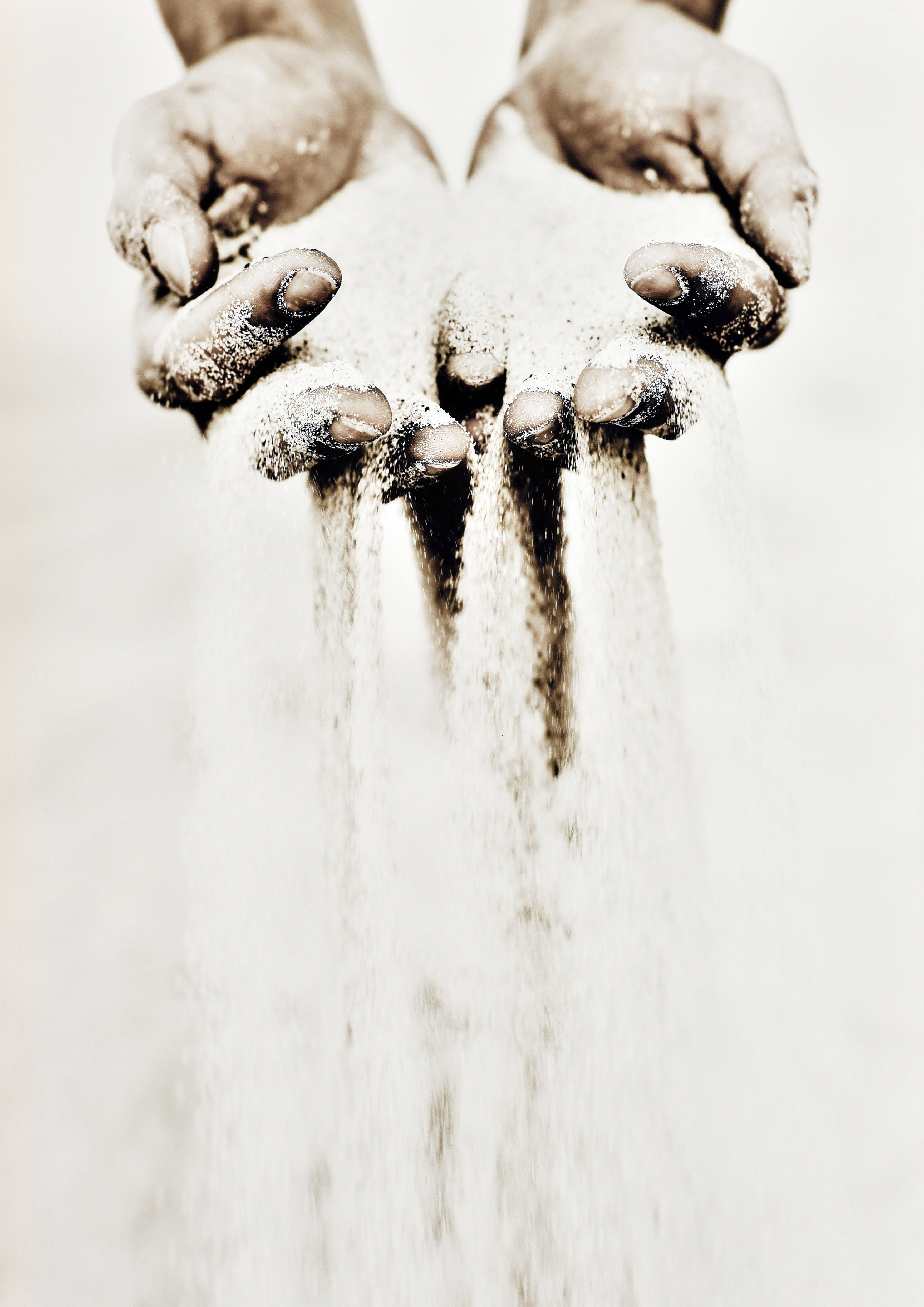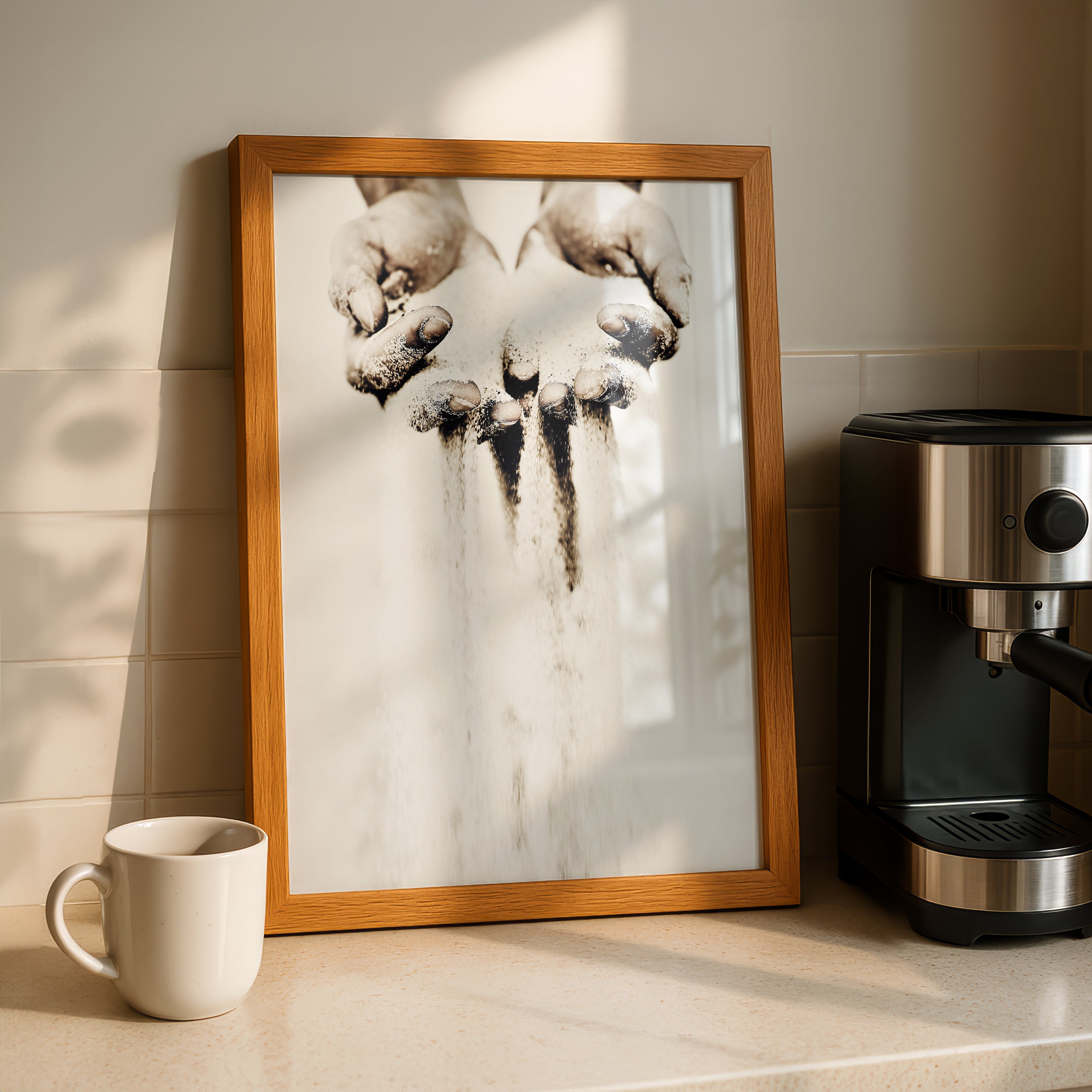 Time Slips Away is a striking photographic artwork capturing a pair of hands releasing sand, symbolising the fleeting nature of time. The falling grains evoke themes of impermanence, memory, and the delicate balance of holding on versus letting go. Its minimal palette of soft neutrals and earthy tones adds to the contemplative, almost meditative quality of the piece.